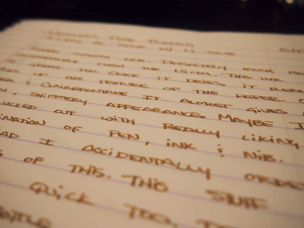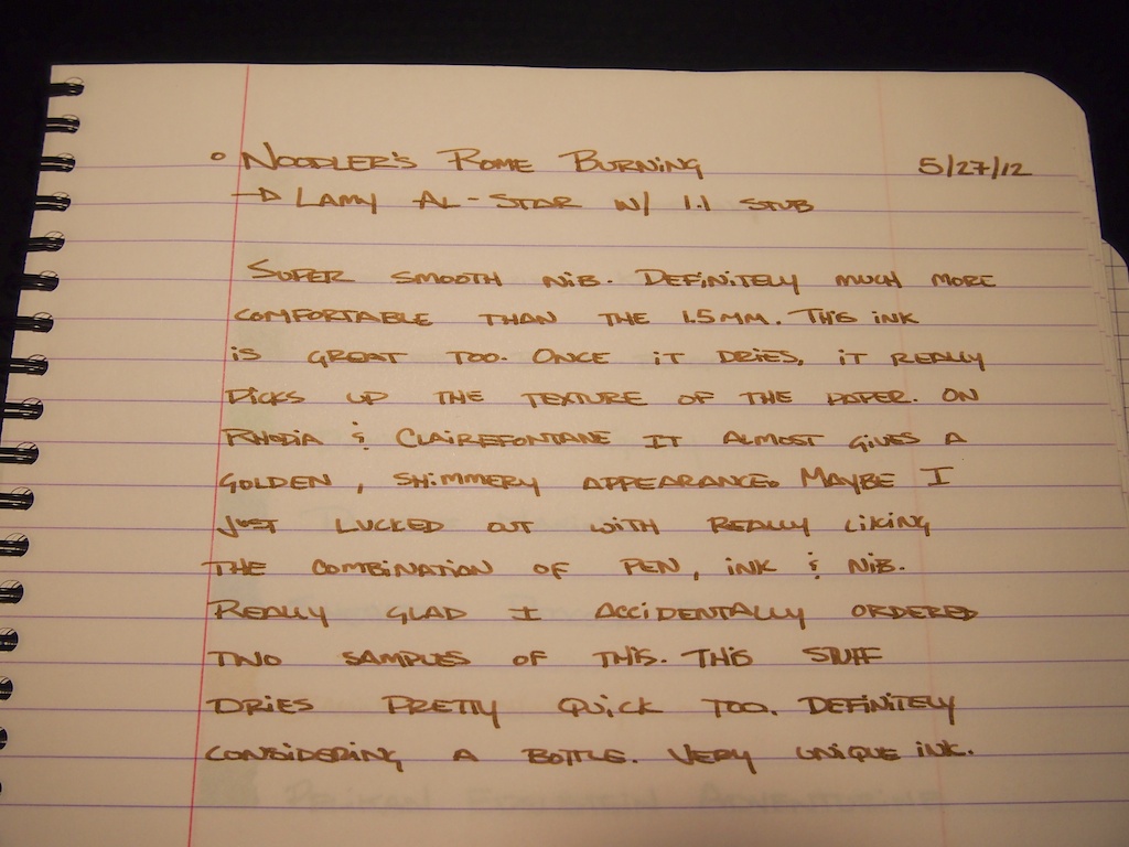 Here’s a handwritten review for Noodler’s Rome Burning. It’s an interesting gold color that reminds me of sand. It has an almost grainy appearance to it when dry. This ink isn’t the most well behaved on cheaper paper, but it’s given me no problems on Rhodia, Black & Red or Maruman.