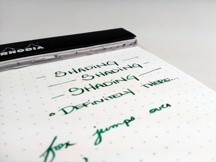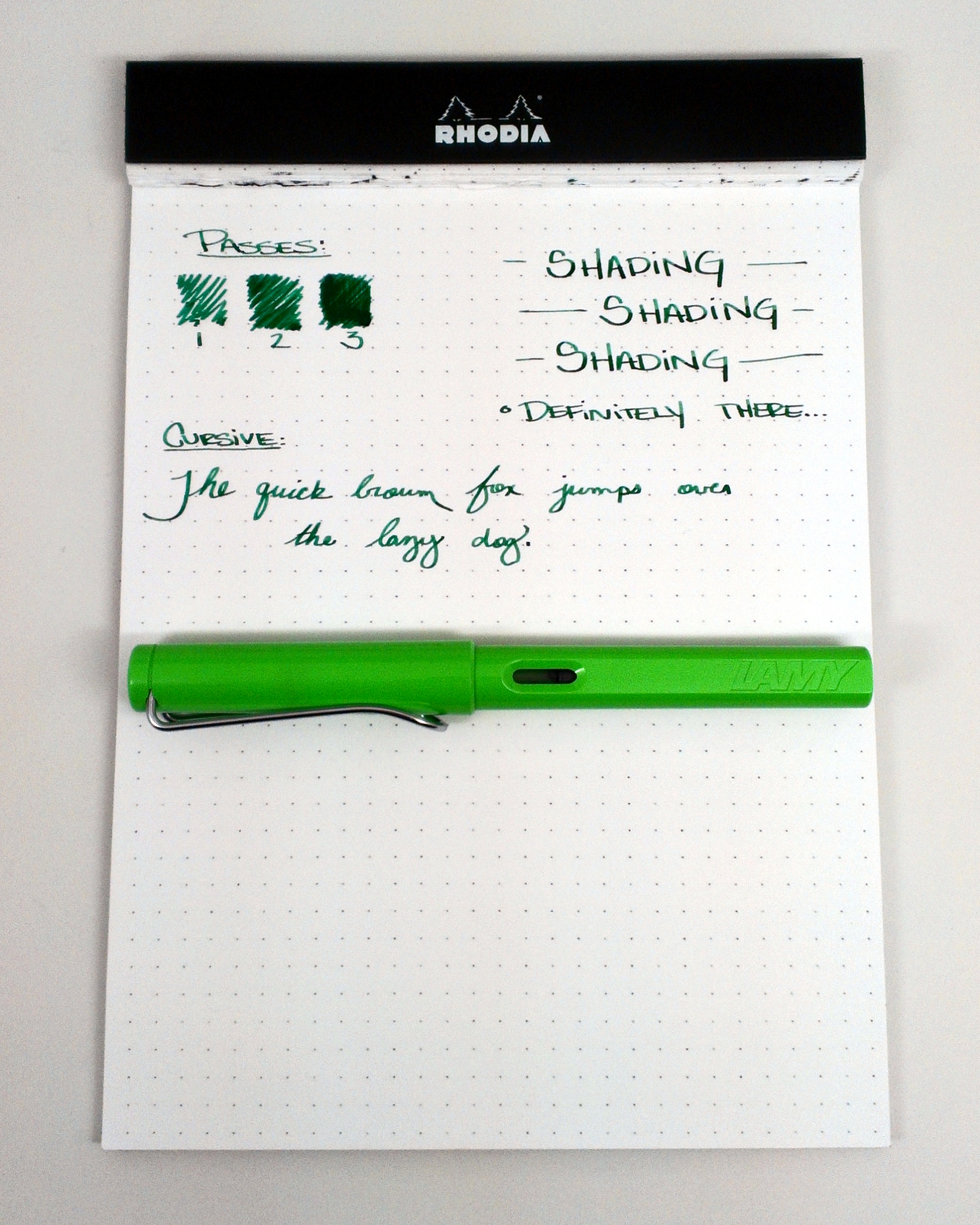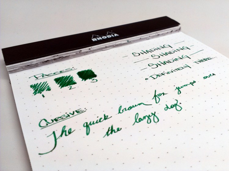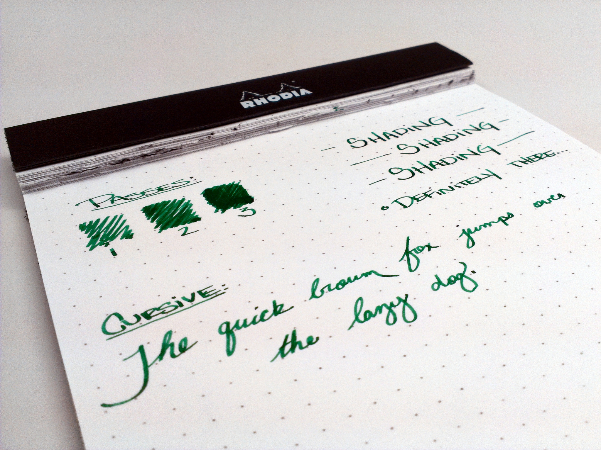 Notes: I bought this ink to go with my Pelikan M605. I hadn’t tried out the ink before buying a bottle, but I really lucked out. It’s a beautiful shade of green with great lubrication, flow and shading properties. It’s my ink of choice for the M605 as it matches the green ink window in the pen. Enjoy the review.