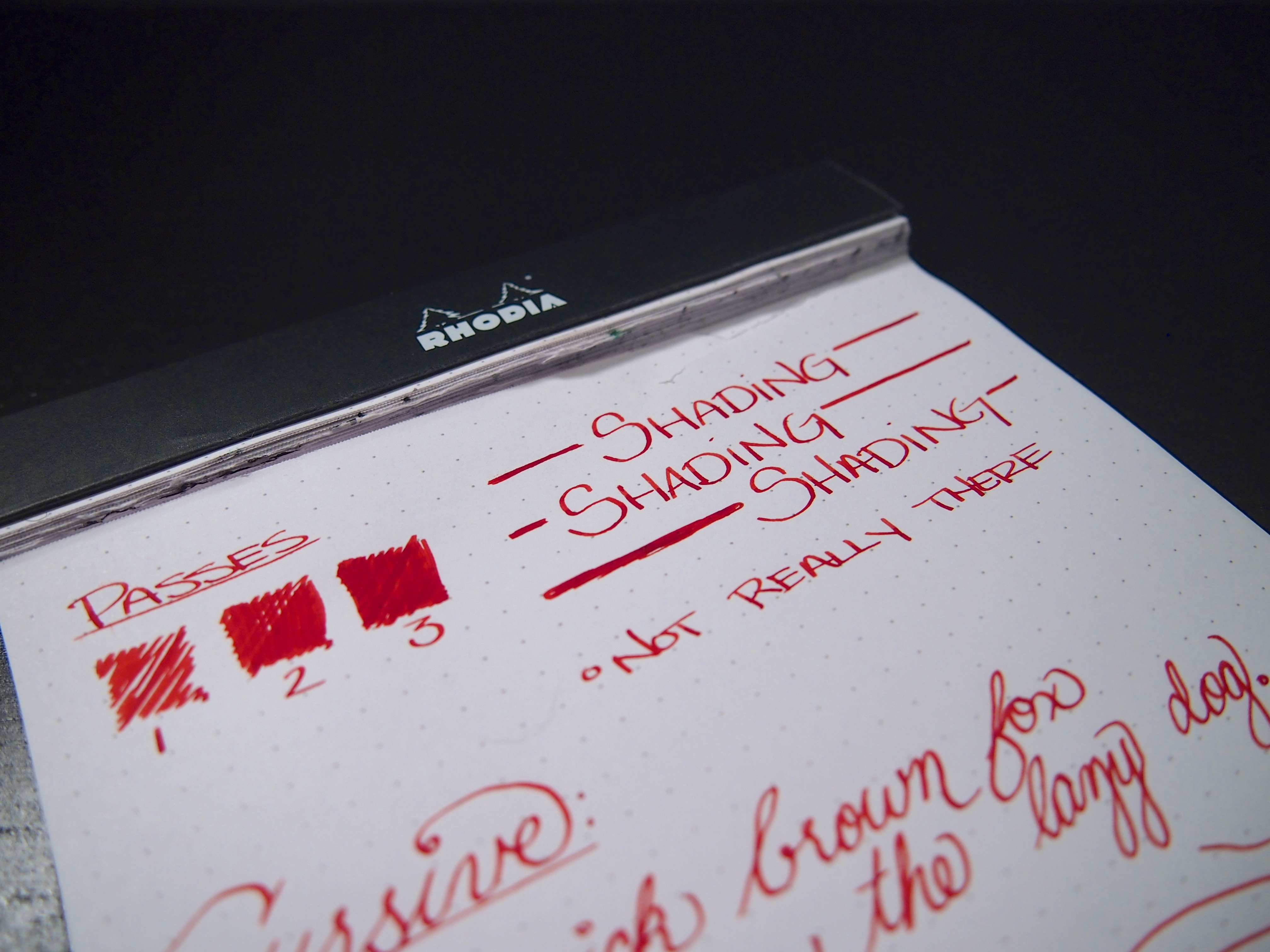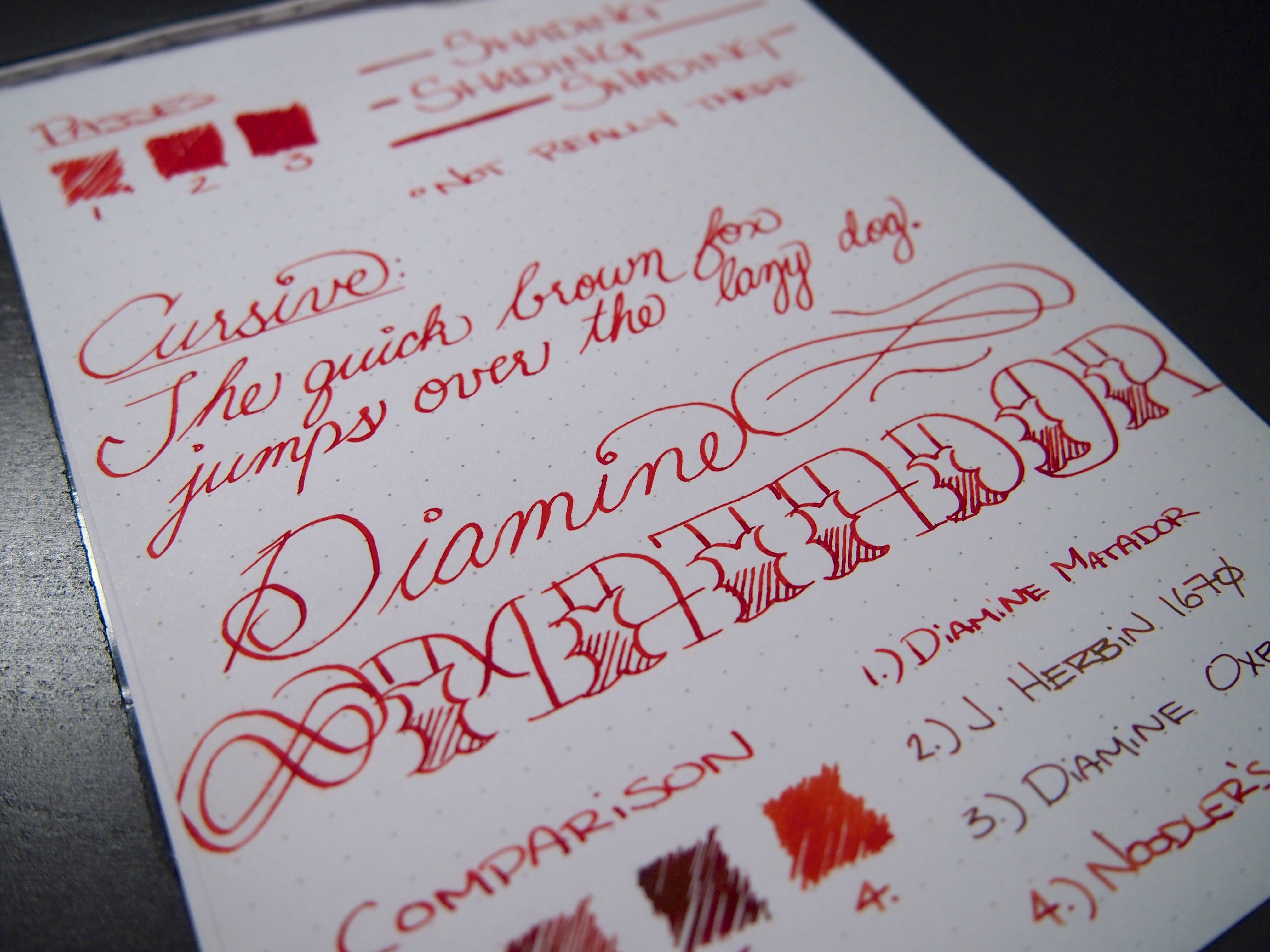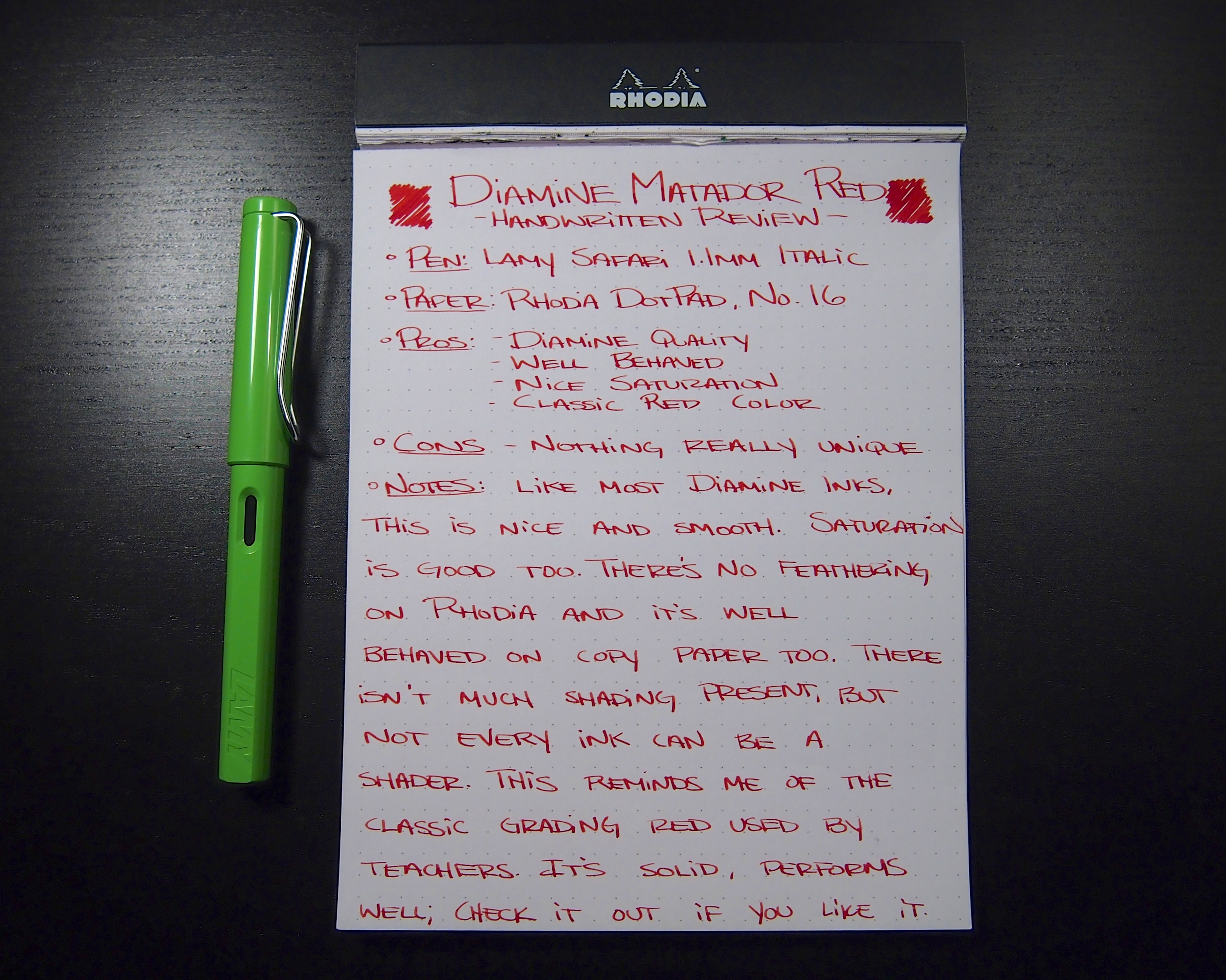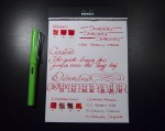 Notes: As much as I love Diamine inks, this one didn’t do much for me. While I have no complaints, I just don’t think there was anything unique about it. I think it’s a really classic red. When I think of the color red, this is pretty much what pops into mind. Don’t get me wrong, it’s a nice ink, but nothing crazy. I have four bottles of Diamine, and I’ve sampled countless others, it’s hard to find something to complain about. They’ve all been well behaved and work well on pretty much any paper, nib depending. Even this stuff wasn’t bad on regular copy paper with the 1.1mm italic, very minimal feathering, if any. Also, I chose to throw this ink in my Lamy Limited Edition 2012 Green Apple pen because it’s almost Christmas. I think my daily carry of mostly matte black pens needed a little red and green cheer.