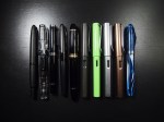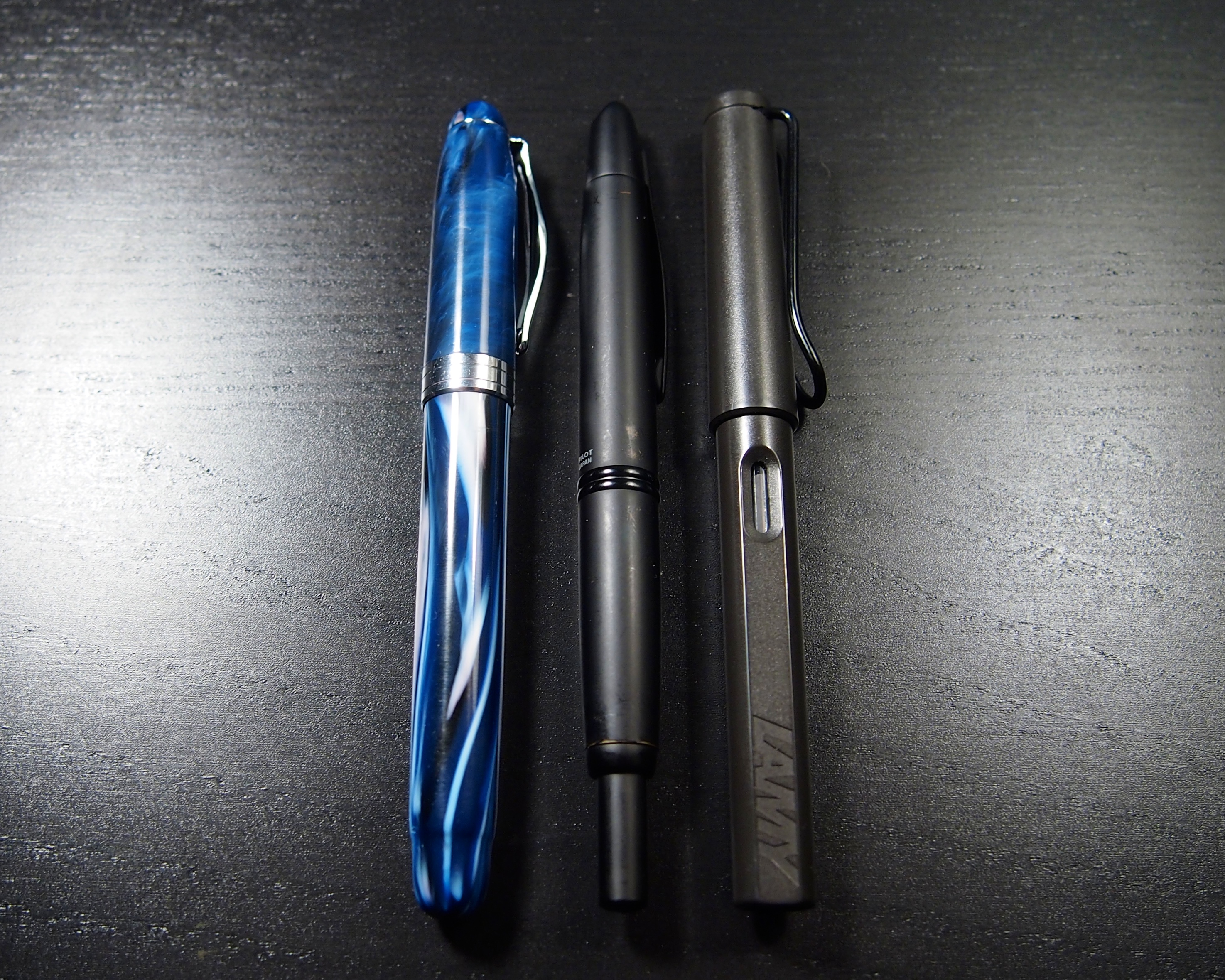This week’s favorites: the Noodler’s Ahab with Diamine Exblood, the Pilot Vanishing Point with Edelstein Aventurine, and the Lamy Safari with Noodler’s Cayenne