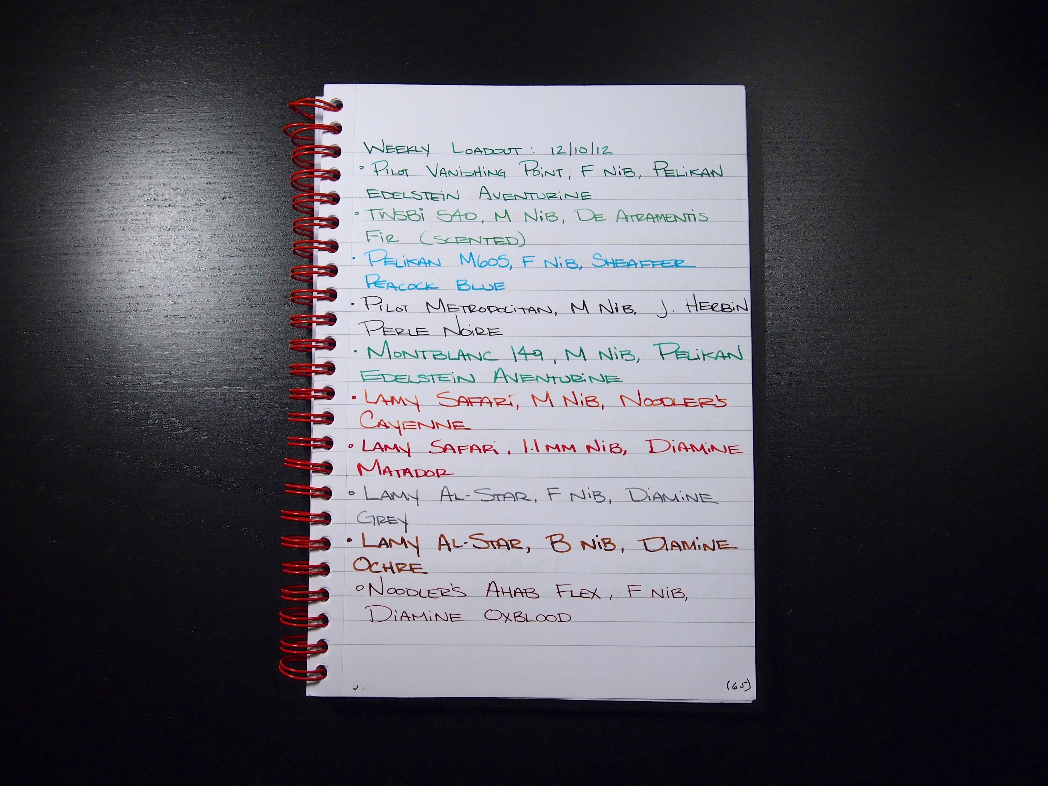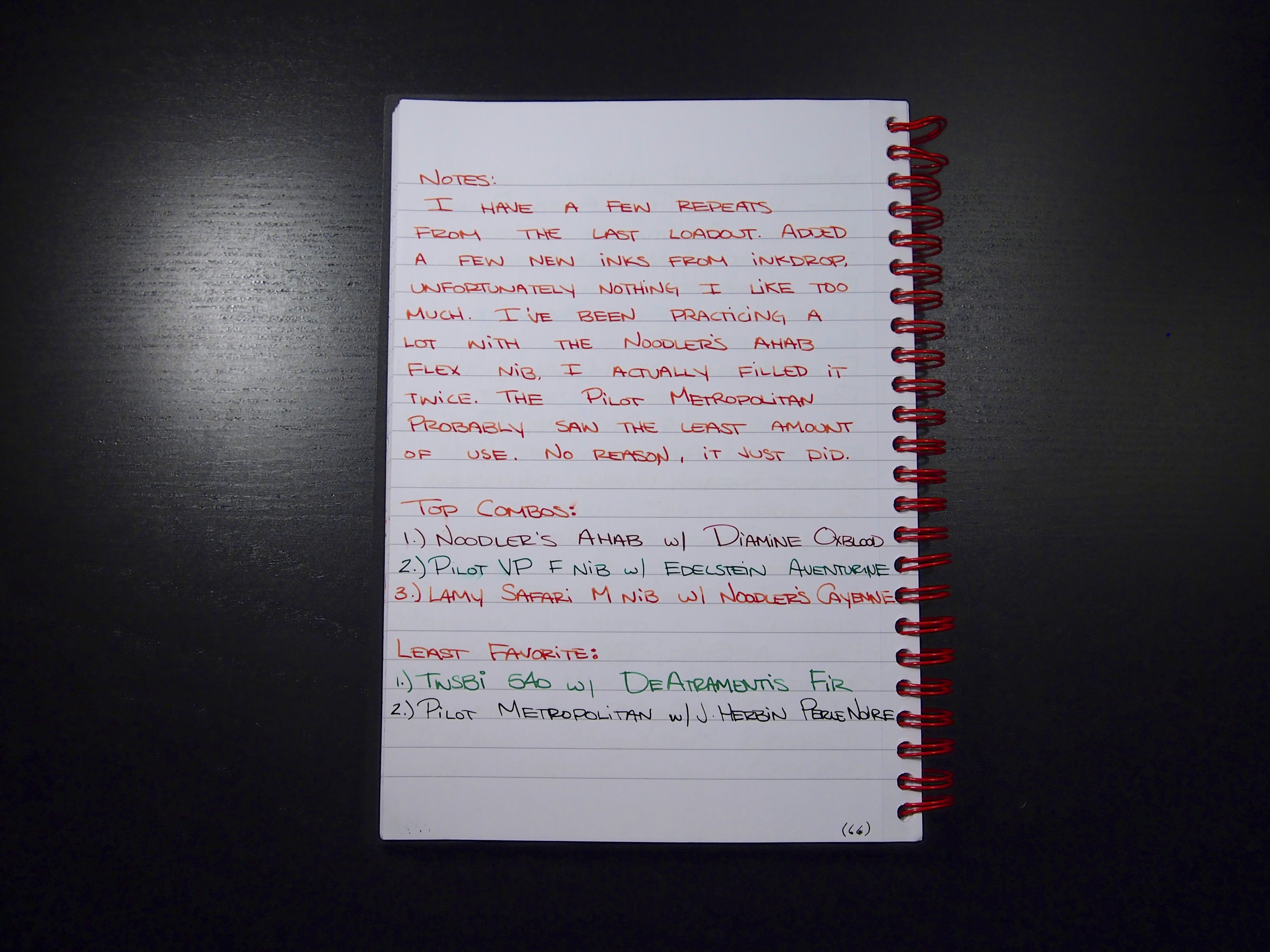 Notes: So for this  Weekly Loadouts section, there are a few repeats. I have two pens inked up with colors from my December Ink Drop samples from Goulet Pens. Unfortunately neither of these really did anything for me. The Diamine is nice, but the De Atramentis Fir Scented Ink I did not like at all. The scent seems gimmicky, and it’s not at all noticeable when writing. The only time I could smell it was when my nose was in the sample vial. I decided to do a few things differently this week. Most of the pens and inks  I’m using this week I have reviewed, so the links above are all for their respective review pages. I also listed my favorite and not-so-favorite pens in this loadout. Also, I have yet to write anything on the Hamelin Black & Red Notepad, so that’s new. I have reviews coming shortly for the pad, a few more inks, and a pen.