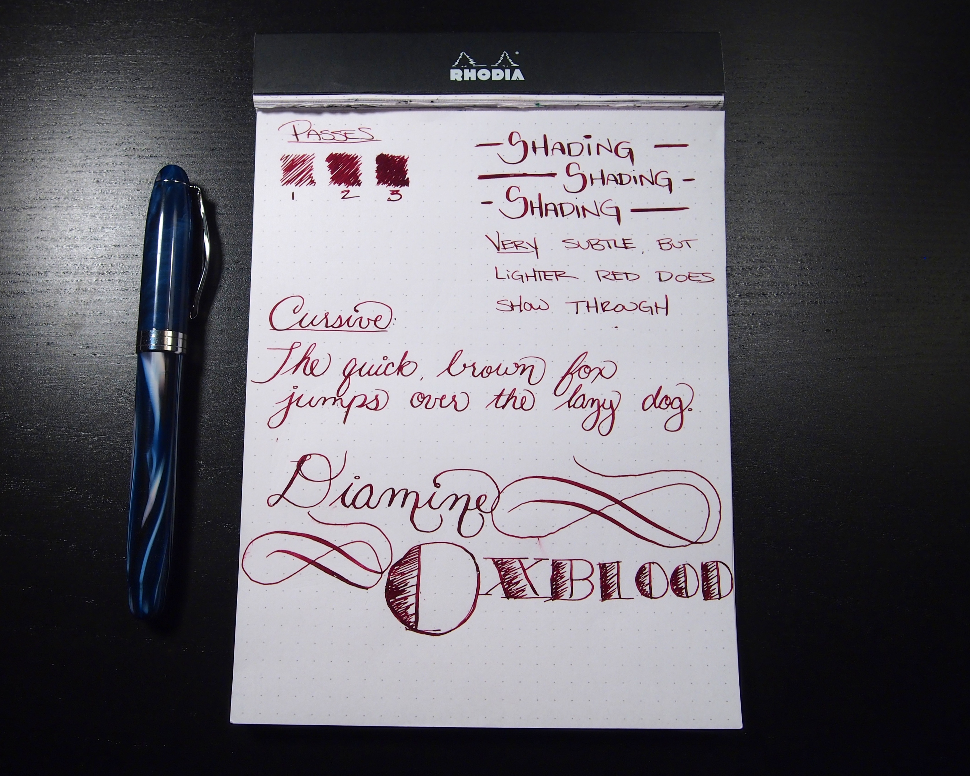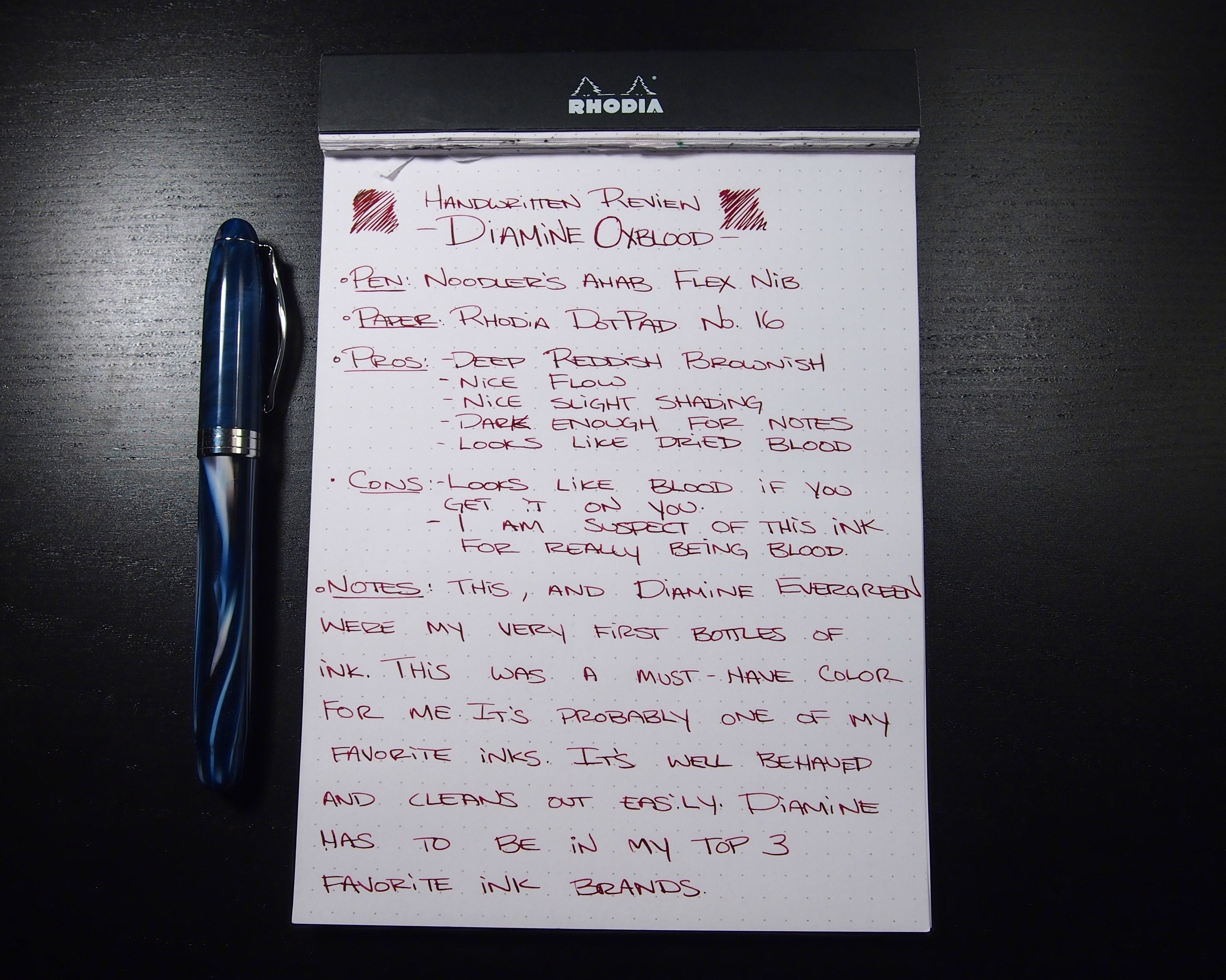 Notes: This was definitely my most used pen/ink combination of the week. You can check out the other stuff I’ve been using over in the Weekly Loadout section. I recently got fed up with the Ahab not working, and started tweaking. I shortened the tube that goes into the feed inside the converter, and increased the bore that it goes into. I carved out the channel with a razor blade a bit, and properly adjusted the nib. Now, this thing works wonderfully. It definitely didn’t before. Now, onto the ink. Diamine Oxblood is probably my favorite ink of all time. The name suits it perfectly. It’s got that deep reddish brown tinge that reminds me of dried blood. It’s well behaved, cleans out relatively easily, and dried quick. I’ve gone through two converters full this week alone. This ink usually has a permanent spot in my daily carry. Enjoy the review!