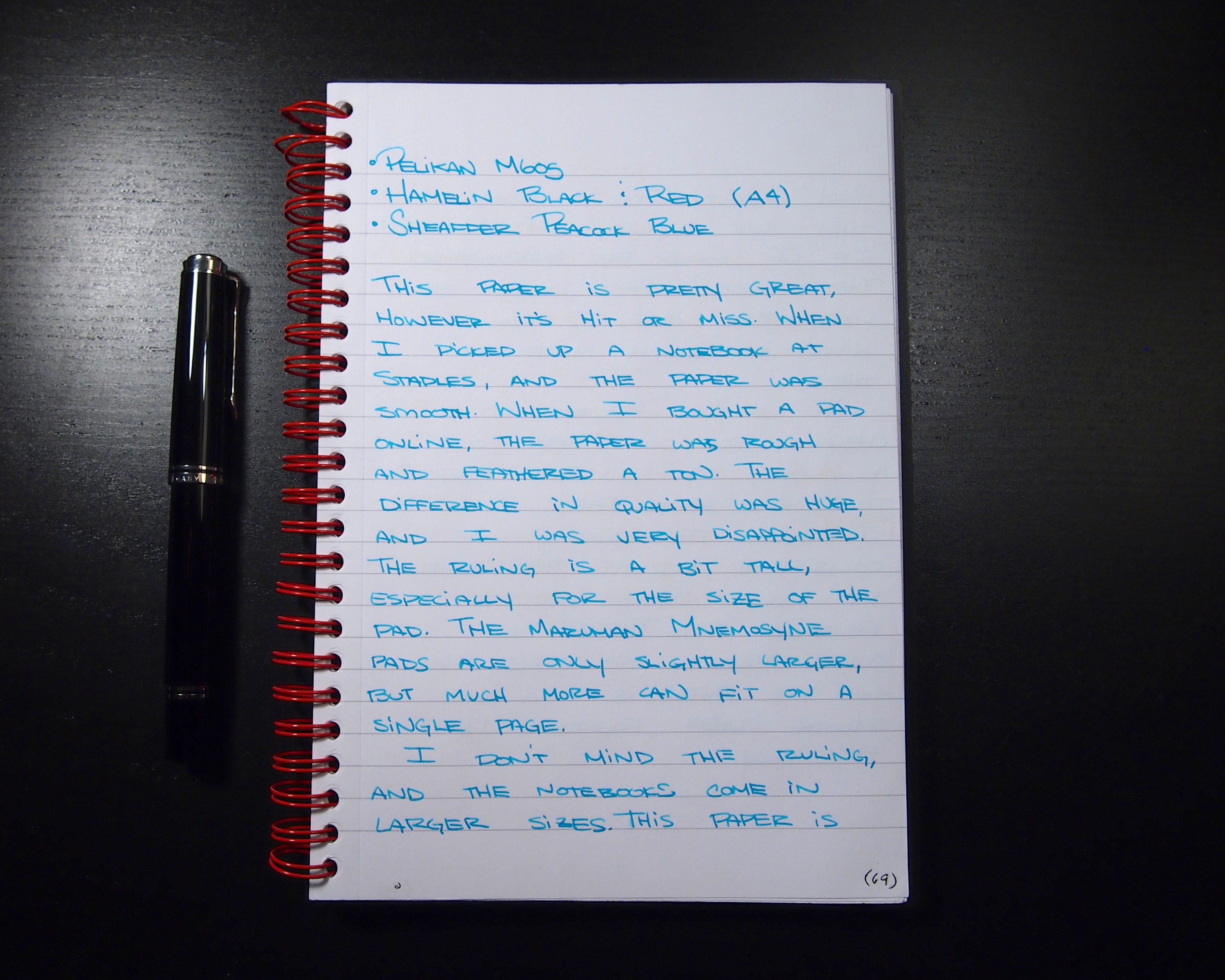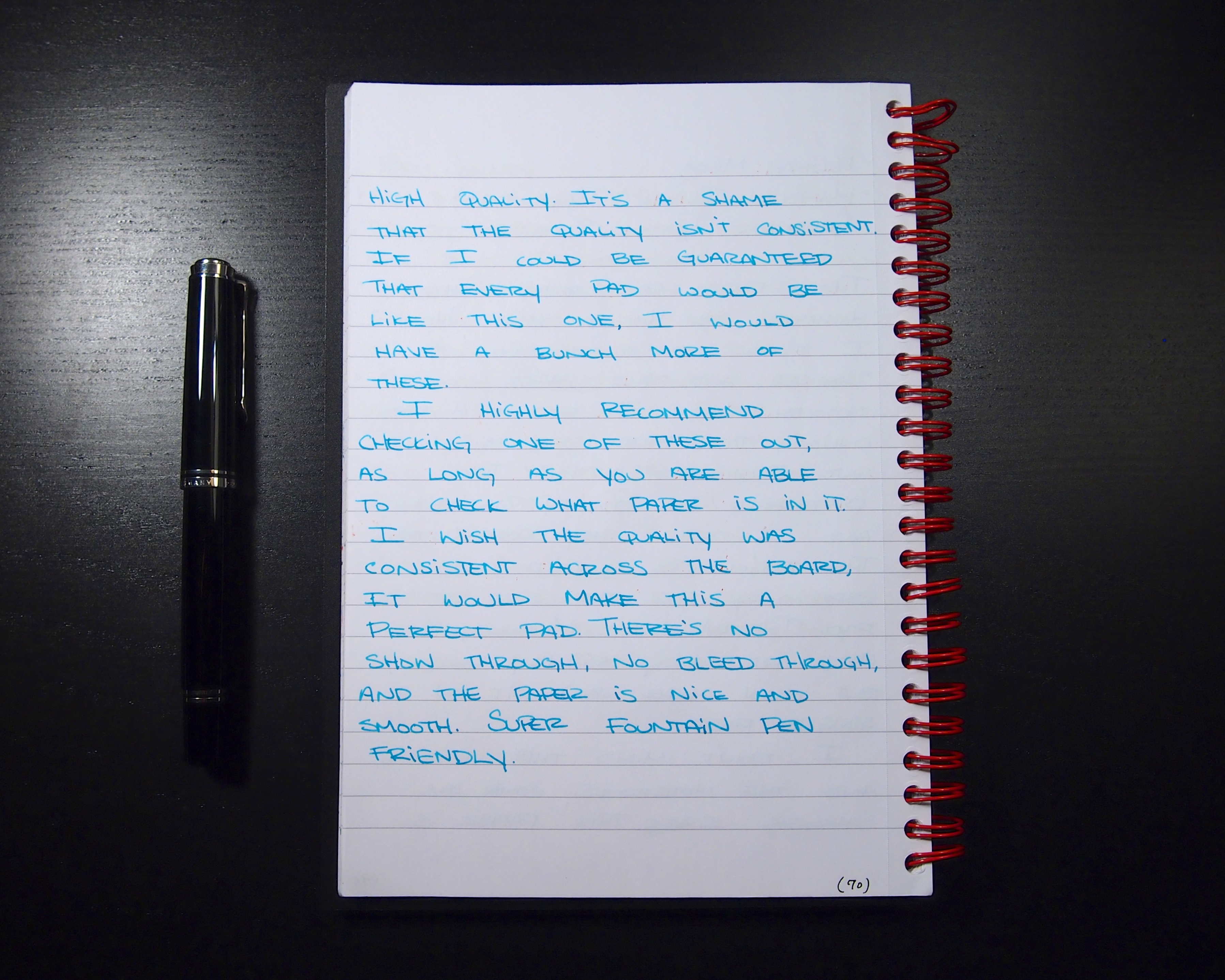 I noticed that Amazon had a pretty solid selection of these pads. I was stoked. They were cheap, looked professional, they were black, and they were fountain pen friendly. So I ordered two of them, one A5 and one A4. When the notebooks arrived, I immediately checked them out. Here’s the disappointment. Totally same notebook, totally different paper. The paper in the one I had ordered online was more textured. There was no sheen to it and ink feathered more so than it did on the last one. Overall, it wasn’t bad paper, it just wasn’t what I was buying it for. Moral of the story: If you’re going to buy Black n’ Red notebooks (I still recommend them), do so in a brick and mortar store so you can verify that it’s the nice paper, not the textured, feathery stuff.
