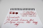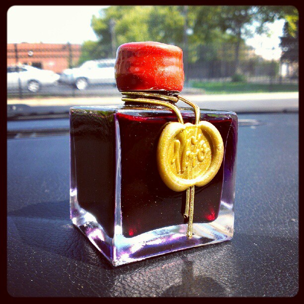 The ink dries pretty slow, and with Rhodia or any slicker paper, the ink doesn’t really like to stay put. If some smearing on the page (which is practically inevitable unless you’re surgically precise with your writing and hand position) and some red-stained hands here and there bother you, I would suggest checking out a sample before committing to an entire bottle. Which brings me to the bottle. It’s looks absolutely stunning. It’s taller than J. Herbin’s other ink bottles, and much more square. It has a golden ribbon that’s held down by a gold wax seal. The cap is coated in red sealing wax as well. The bottle is a great piece to have on my desk along with my other more visually pleasing bottles. The only thing about the bottle is that the mouth isn’t very wide, and pens with a thicker grip could have trouble filling. It’s a small trade off, plus, it’s up to the Germans to provide form and function, the French just make everything look pretty (from a design standpoint anyway).