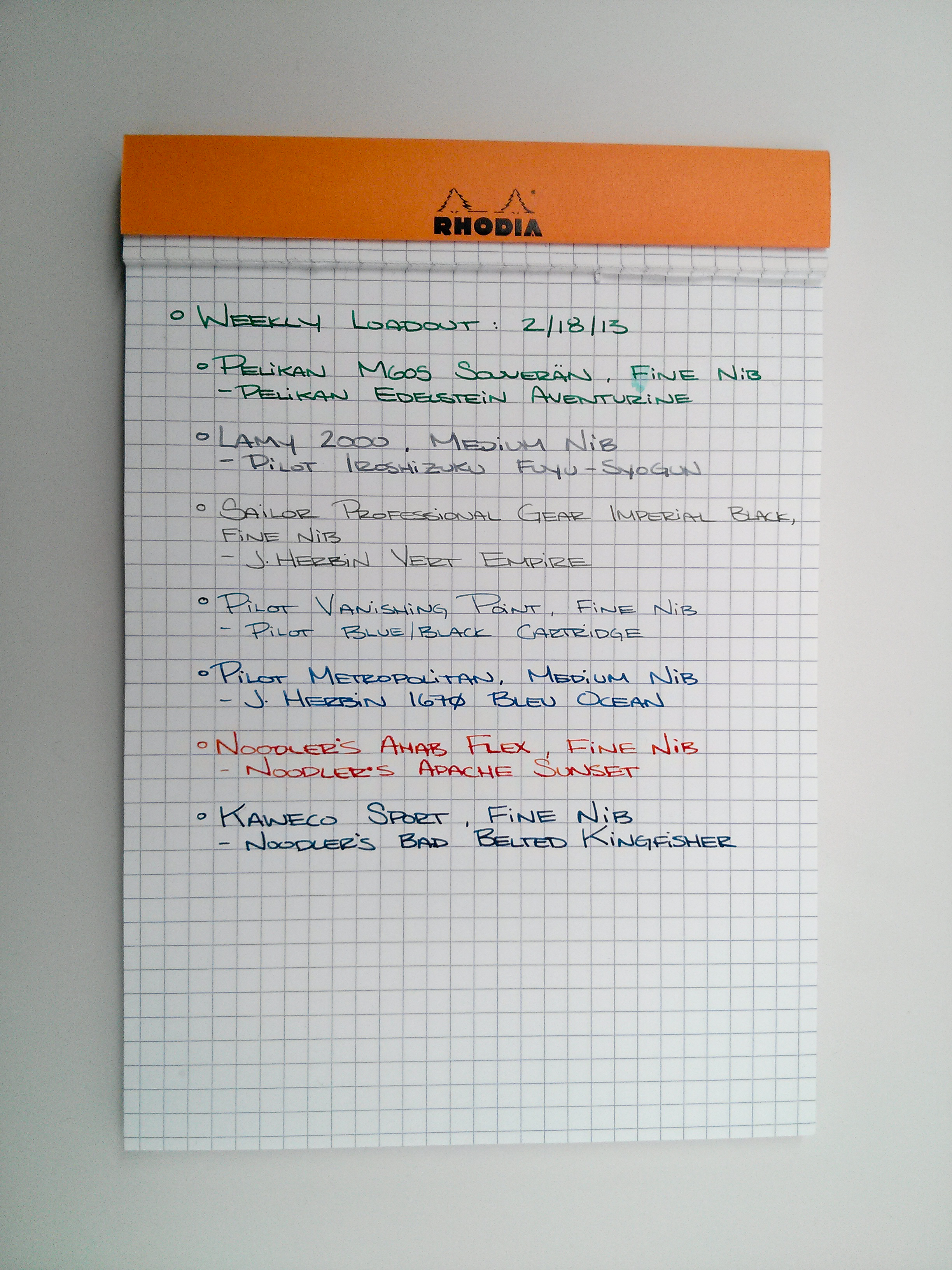 Notes: Wow, I have seriously been slacking on these. It’s turned into more of a bi-weekly, sometimes three weekly, maybe monthly loadout? I haven’t been changing inks all that much because I’ve been stupid busy with school, work, and other work, and the dog. So I apologize for not posting these weekly, but changing the name is too much work. SO. This Weekly Loadout has a pretty serious amount of matte black going on. I’m pretty much settled in with everything I have. Also, if something in the list doesn’t have a link associated, there’s a pretty good chance that there’s a review coming in the very near future. I would give some opinions if everything wasn’t already being reviewed / in queue to be posted, so I’m going to save myself some time, and possibly build up some hype/excitement for new stuff. I apologize if the pictures aren’t as great as they could be. I used my new Nexus 4, and I’m not totally thrilled with the camera. It’s a great device, but the camera definitely leaves something to be desired. I feel like a walking contradiction, I need the latest phones / technology, yet I prefer a fountain pen and NEED a mechanical watch on my wrist.