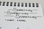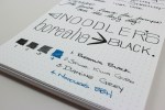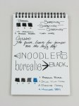 Notes: So after trying easily 20+ black inks, I finally got around to properly reviewing one. When I got into fountain pens, my first task was to find the perfect black ink. I never did formal reviews, but there are pages upon pages UPON PAGES of Rhodia completely filled with doodles, notes, opinions, etc. on different black inks. This particular sample came with my Goulet Pens ink drop, and I figured why not give it a try. I wasn’t a huge fan of the Borealis Black. It tends to feather, even on Rhodia. The flow and smoothness were nice but I also had some problems with dry time (as you can see below). What really stood out was the deeply saturated black and the smoothness of the ink. It was a pleasure to write with, but I couldn’t see myself with a bottle when there are black inks out there I much prefer. Enjoy the review. I think I’ll be doing more reviews of black inks, depending on how this one goes.