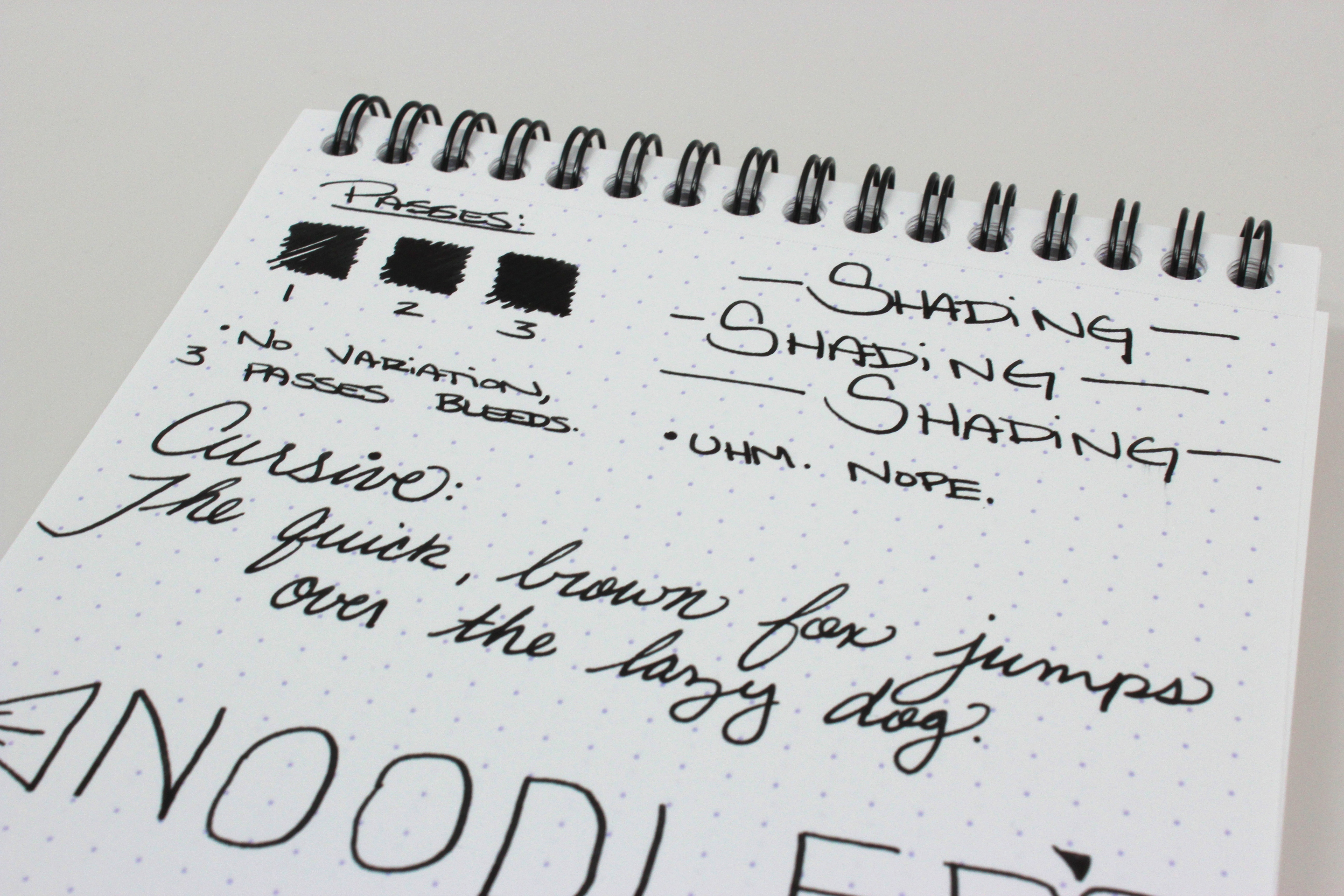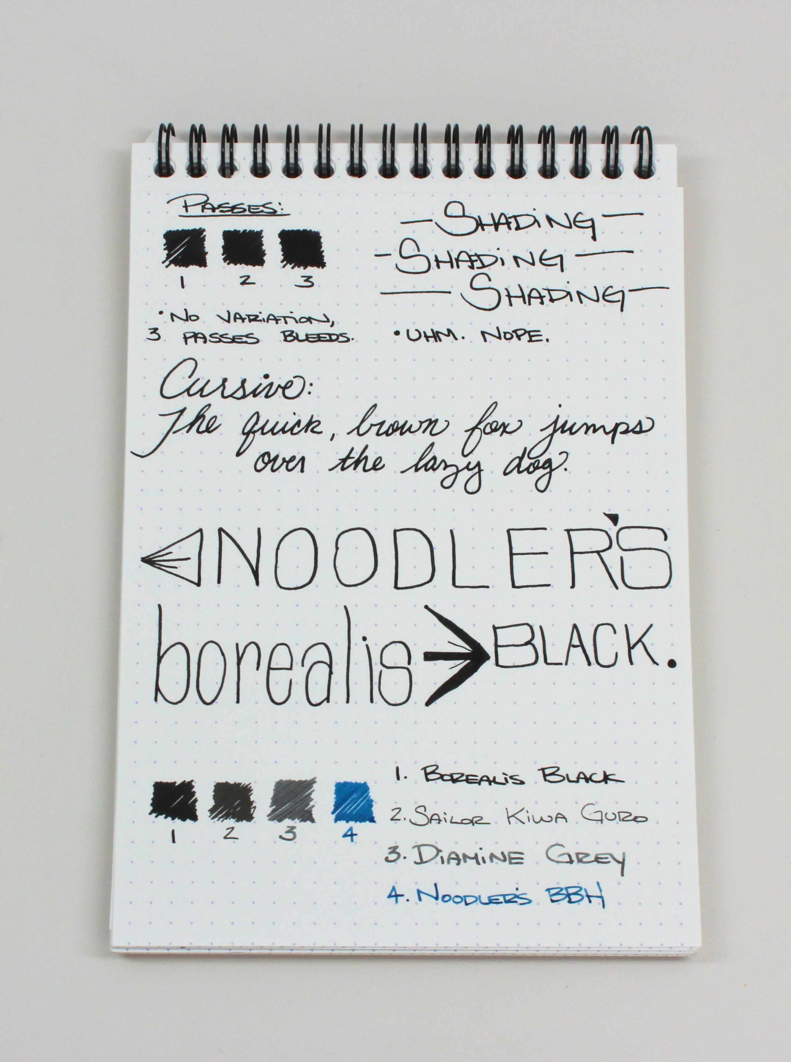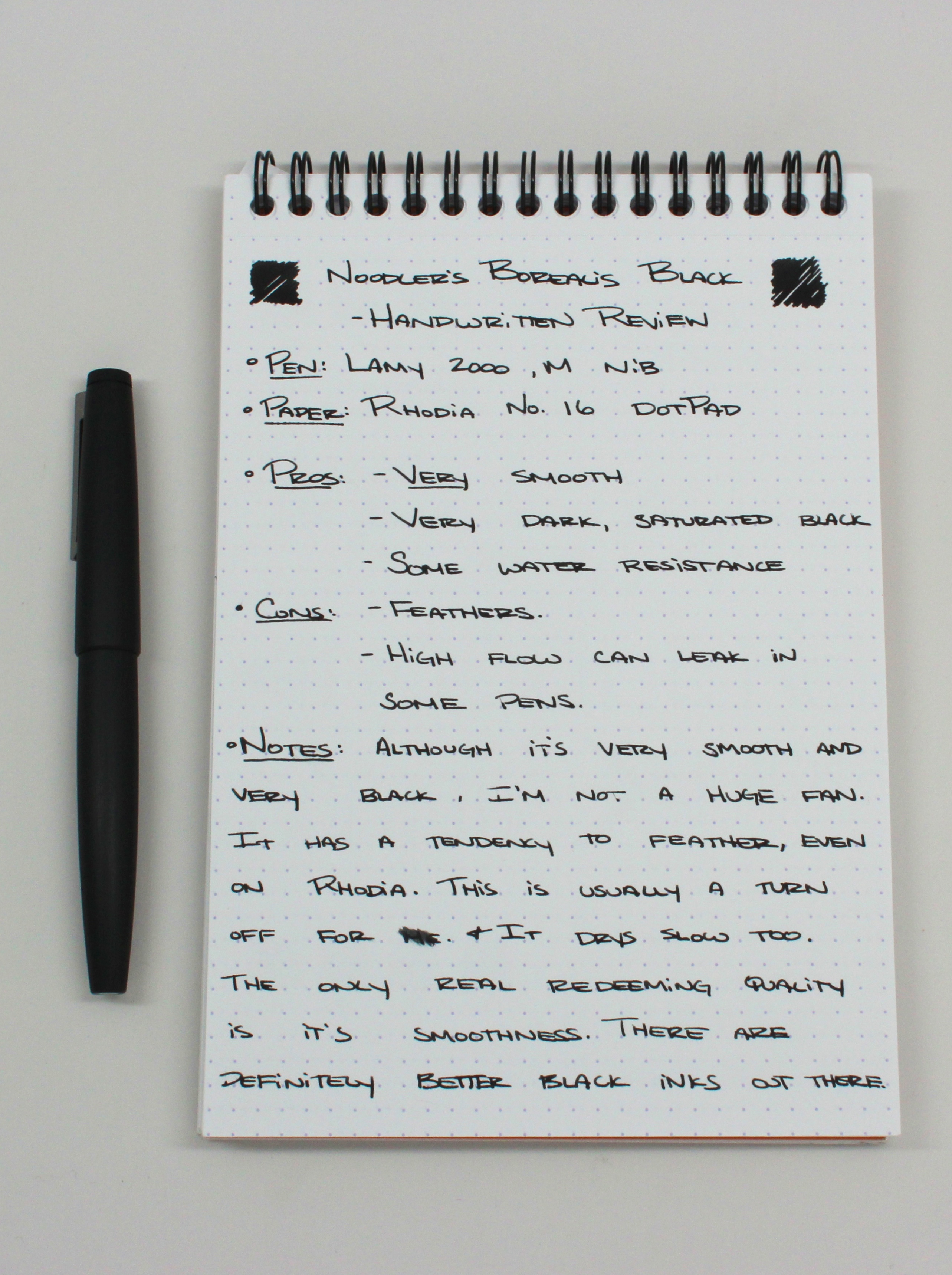 Notes: So after trying easily 20+ black inks, I finally got around to properly reviewing one. When I got into fountain pens, my first task was to find the perfect black ink. I never did formal reviews, but there are pages upon pages UPON PAGES of Rhodia completely filled with doodles, notes, opinions, etc. on different black inks. This particular sample came with my Goulet Pens ink drop, and I figured why not give it a try. I wasn’t a huge fan of the Borealis Black. It tends to feather, even on Rhodia. The flow and smoothness were nice but I also had some problems with dry time (as you can see below). What really stood out was the deeply saturated black and the smoothness of the ink. It was a pleasure to write with, but I couldn’t see myself with a bottle when there are black inks out there I much prefer. Enjoy the review. I think I’ll be doing more reviews of black inks, depending on how this one goes.