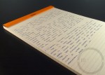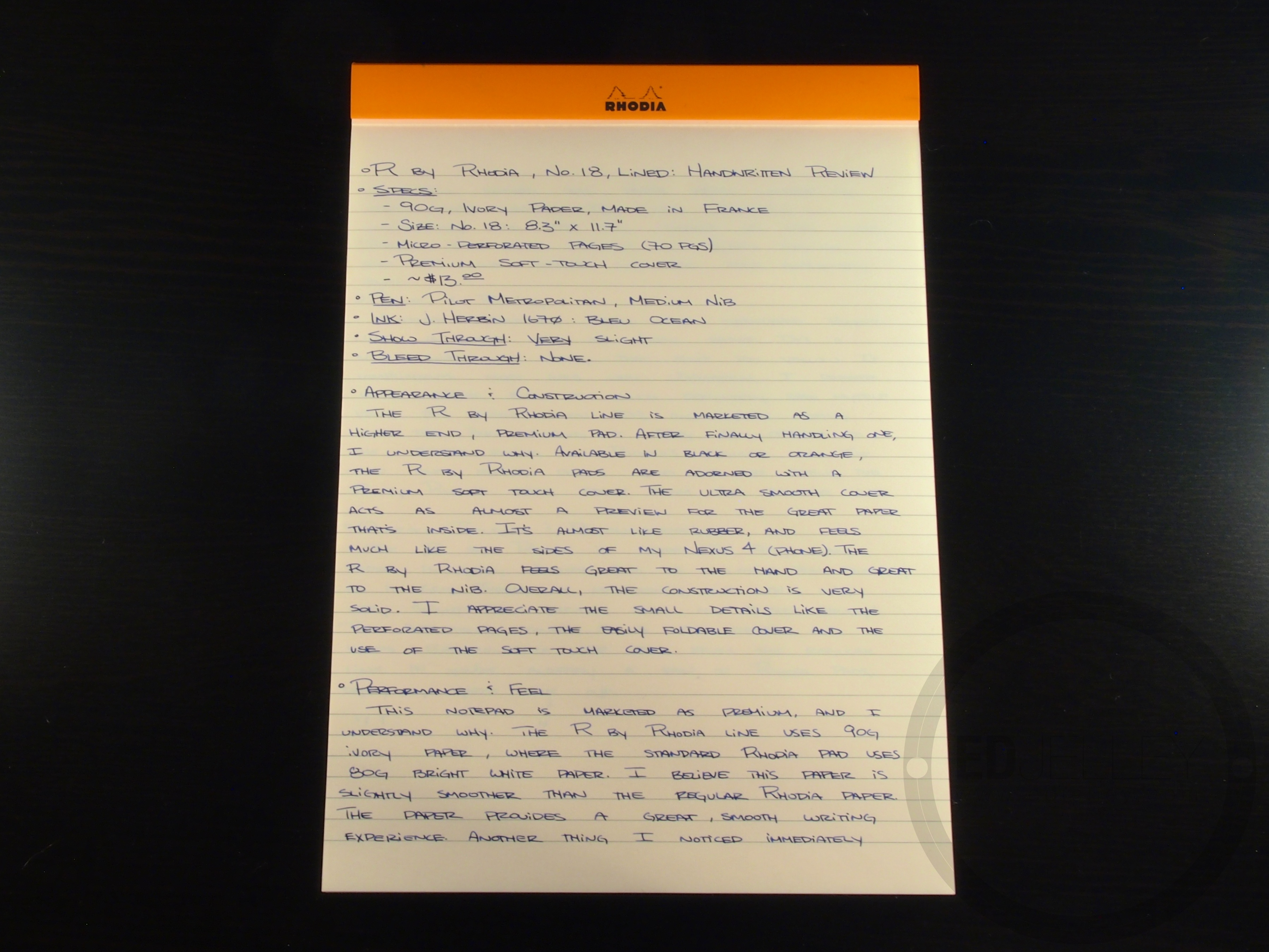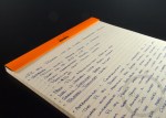 The R by Rhodia line is marketed as a higher end, premium pad. After finally handling one, I understand why. Available in black or orange, the R by Rhodia pads are adorned with a premium soft-touch cover. The ultra smooth, almost rubber-like cover is a nice preview for the exceptionally smooth paper that’s inside. It’s almost like neoprene rubber and feels much like the “soft-touch rubber” on the sides of my Nexus 4 (phone). The R by Rhodia feels great under the hand and great to the nib. The construction is solid, and I have no concerns of durability. I didn’t try, but I believe the cover has some water resistance, and could easily survive a quick carry through the rain. I can appreciate the small details like the micro-perforated pages, the foldable cover, and the soft-touch treatment on the outside of the pad.