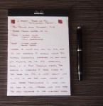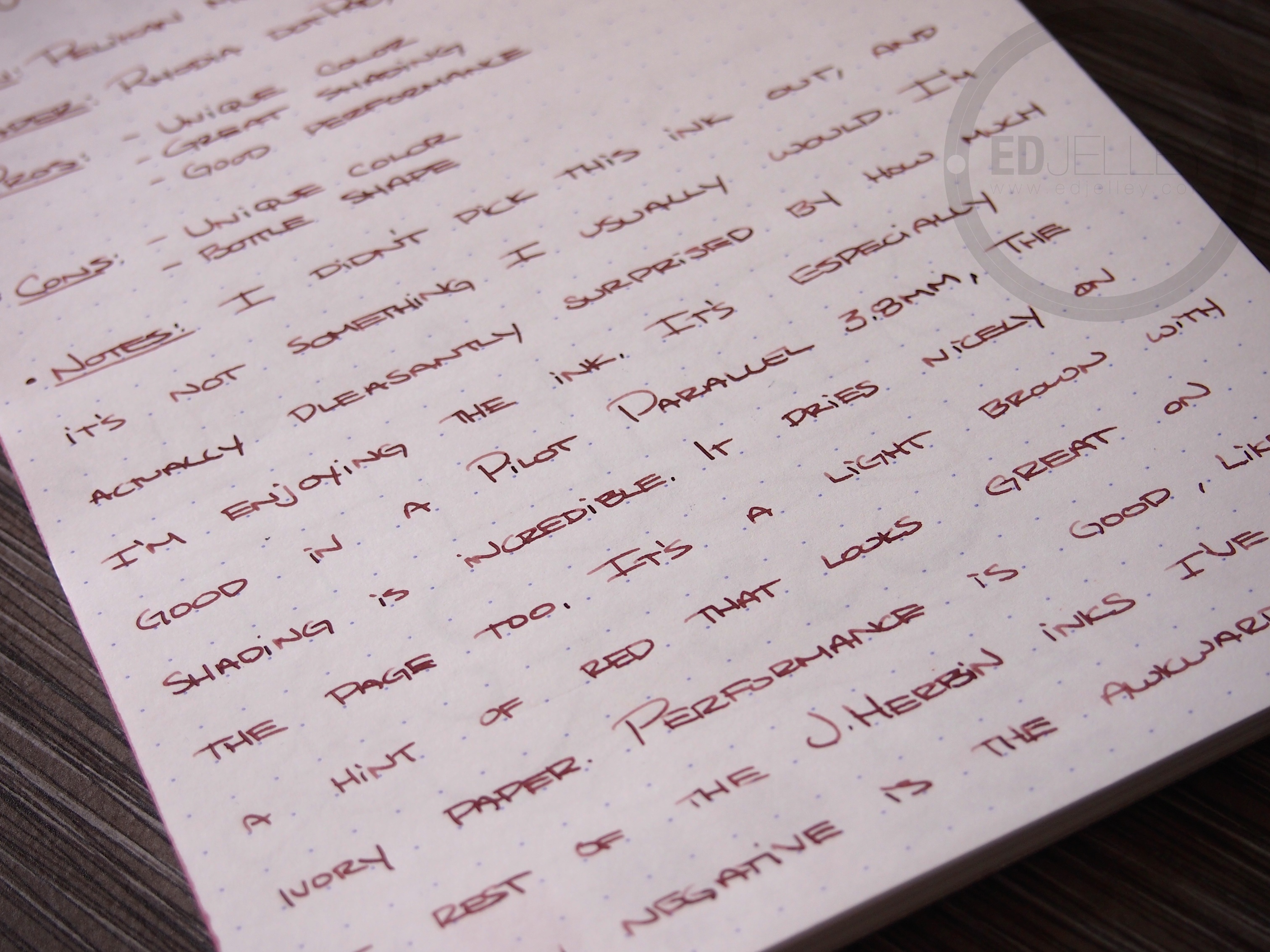 Notes: If you notice that I put “unique color” as both a pro and a con. The ink is definitely a different color from the offerings out there. I didn’t pick this ink out, and it’s not something I usually would. I’m actually pleasantly surprised by how much I’ve been enjoying it though. It’s especially good (due to the great shading) in a Pilot Parallel 3.8mm, the shading is incredible. It also dries nicely on the page. I would call Terre de Feu (Land of Fire) a medium reddish brown. When you translate the name from French, it does a pretty good job of describing the ink. I particularly like this ink on ivory paper, as it cuts down on some of the red and looks almost like a sepia. Like most J. Herbin inks, the performance is good but the bottle is poorly designed. I like the ink quite a bit and use it on a regular basis. Overall, it’s definitely worth checking out.