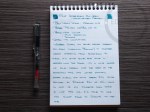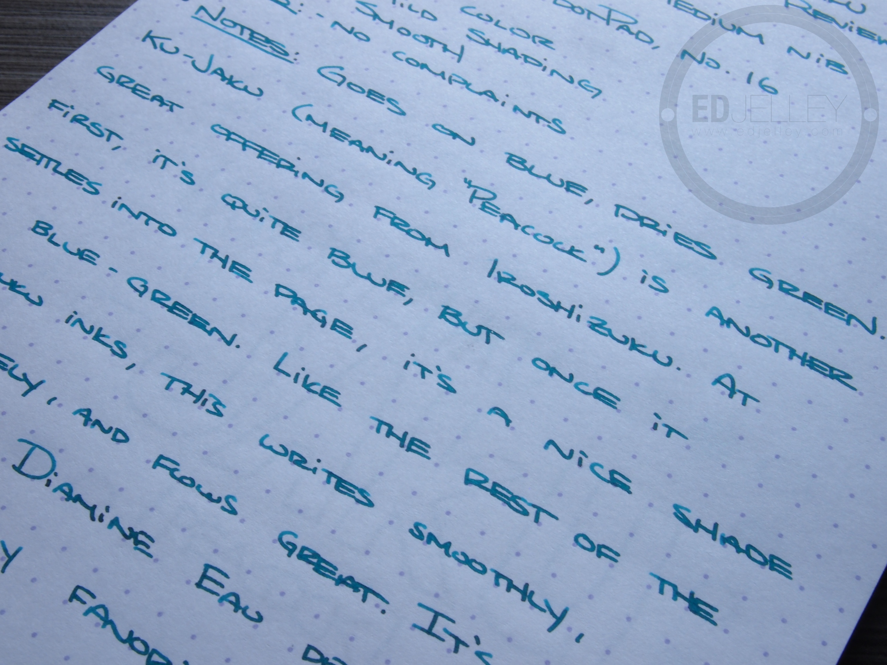 Goes on blue, dries green. Ku-Jaku (meaning “peacock”) is another great ink offering from the Iroshizuku line. At first, it’s very blue, but once it settles into the page, it’s a nice shade of blue-green. Like the rest of the Iroshizuku line I’ve sampled, the ink performs well. It writes smoothly, shades nicely, and has great flow. It’s similar to Diamine Eau de Nil, which is one of my favorite inks. I like the color and performance of this ink, but given that they’re so close in color (and the price difference), I’d have to give the edge to the Diamine.