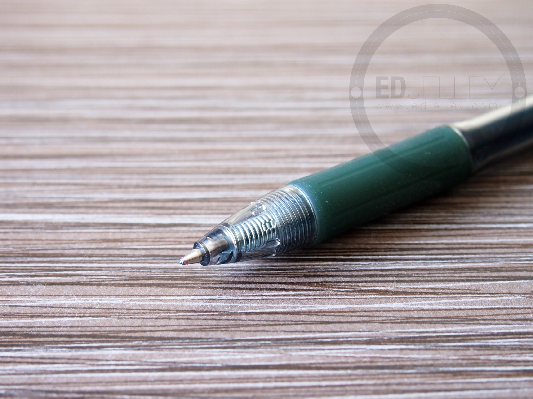 Packaging was nothing crazy, as is the trend with most cheaper pens. It is worth noting that the 10-pack came with a heavier (but by no means durable) plastic carrying case. It’s nice to keep all of them in the same spot instead of throwing them into a pen cup. The Sarasa looks like your standard, every day retractable pen. The plastic body is tinted grey, giving the pen a less intense appearance (which I like). The rubber grip is soft and comfortable with minimal texturization going on. Unlike the Pilot Hi-Tec-C and the Uni Signo DX, the Sarasa is completely plastic and rubber, including the tip of the pen (which is metal on the other two aforementioned pens). The pen is very light and the barrel diameter is not too thin and not too wide, making it very comfortable to hold and write with. The Sarasa is just slightly thicker than the Uni Signo.