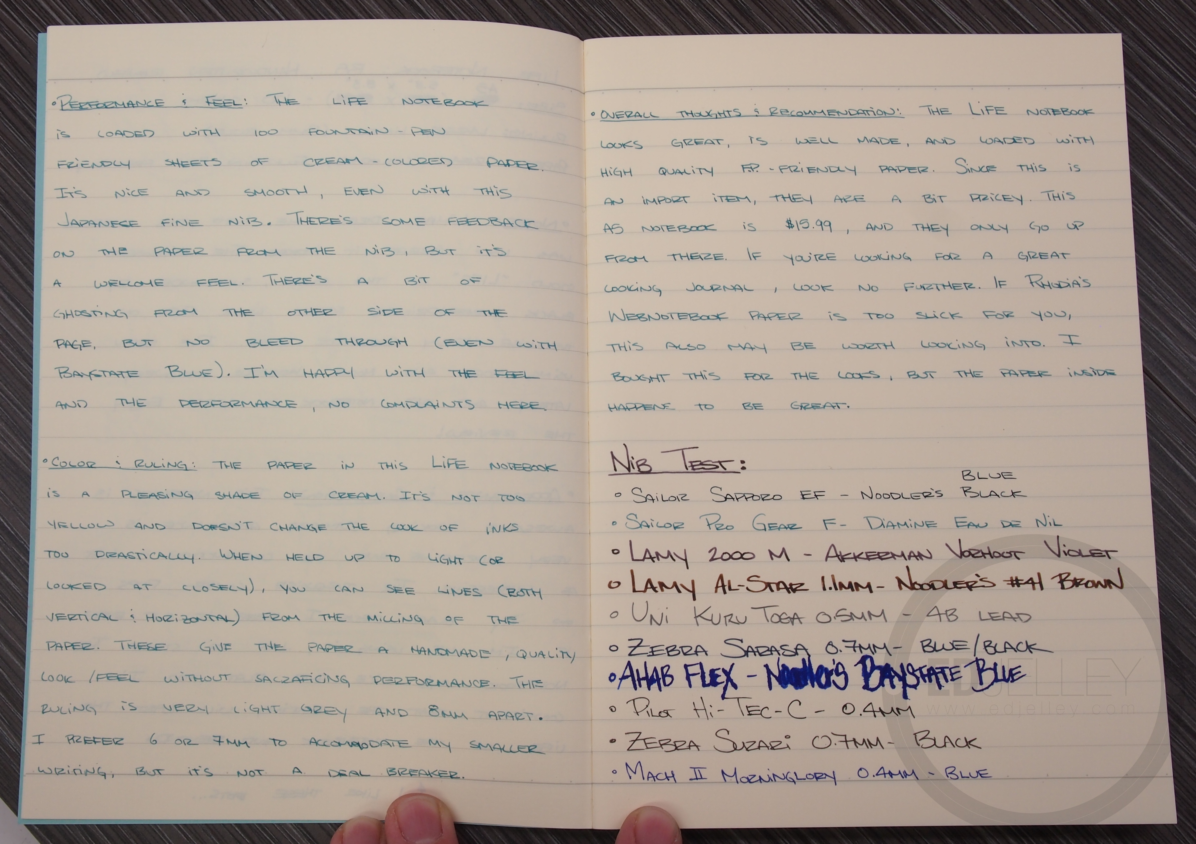 2. Sorry for such a late comment, but I just read your review and found that it reflects my experience with this notebook, too. Like you, I really appreciate the slight feedback the paper gives. I like to feel my pen on the paper. Lately I’ve had the unpleasant experience of several of my stub nibs sliding around & skipping on paper that is too slick. I ordered a couple of these Life notebooks, remembering that they seemed slightly more toothy. And my memory was right; the paper is the perfect balance between smooth creaminess and feedback. In my mind, I think of a feedback like this as “sweet.” I also like the creamy ivory color; it’s a nice change from stark white or eggshell. Personally, I kind of like it when ink colors are slightly influenced by the color of the paper, as long as it’s not overpowering. And while I can handle 6 mm lines, I prefer at least 7 mm; however, 8 mm gives me the freedom to be more expressive with my handwriting, so it’s a nice change. I’m glad that I rediscovered this notebook and plan to keep several on hand in the future. BTW: I found some at a great price on Amazon. I’m all for supporting small stationery shops, but when I can save $6 – $7 per notebook, I’m gonna snatch up a few. Of course, the price I found might just be a Christmas sale, but hey, I’ll take a nice discount when it’s available! Ed, thanks for another great review.
