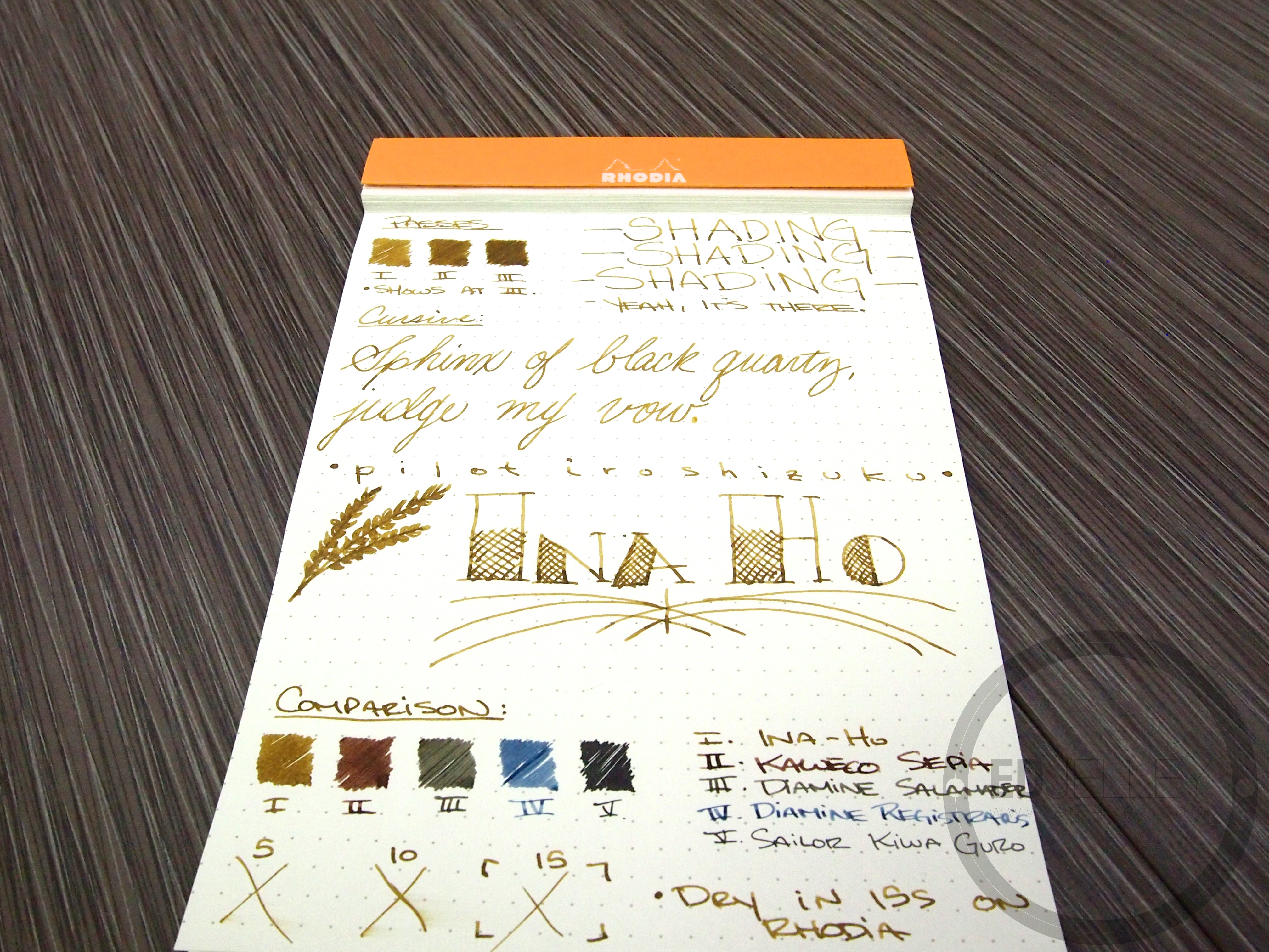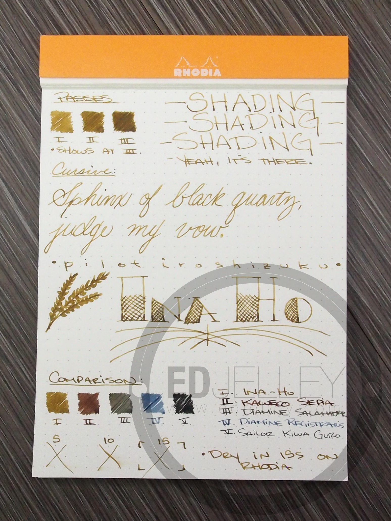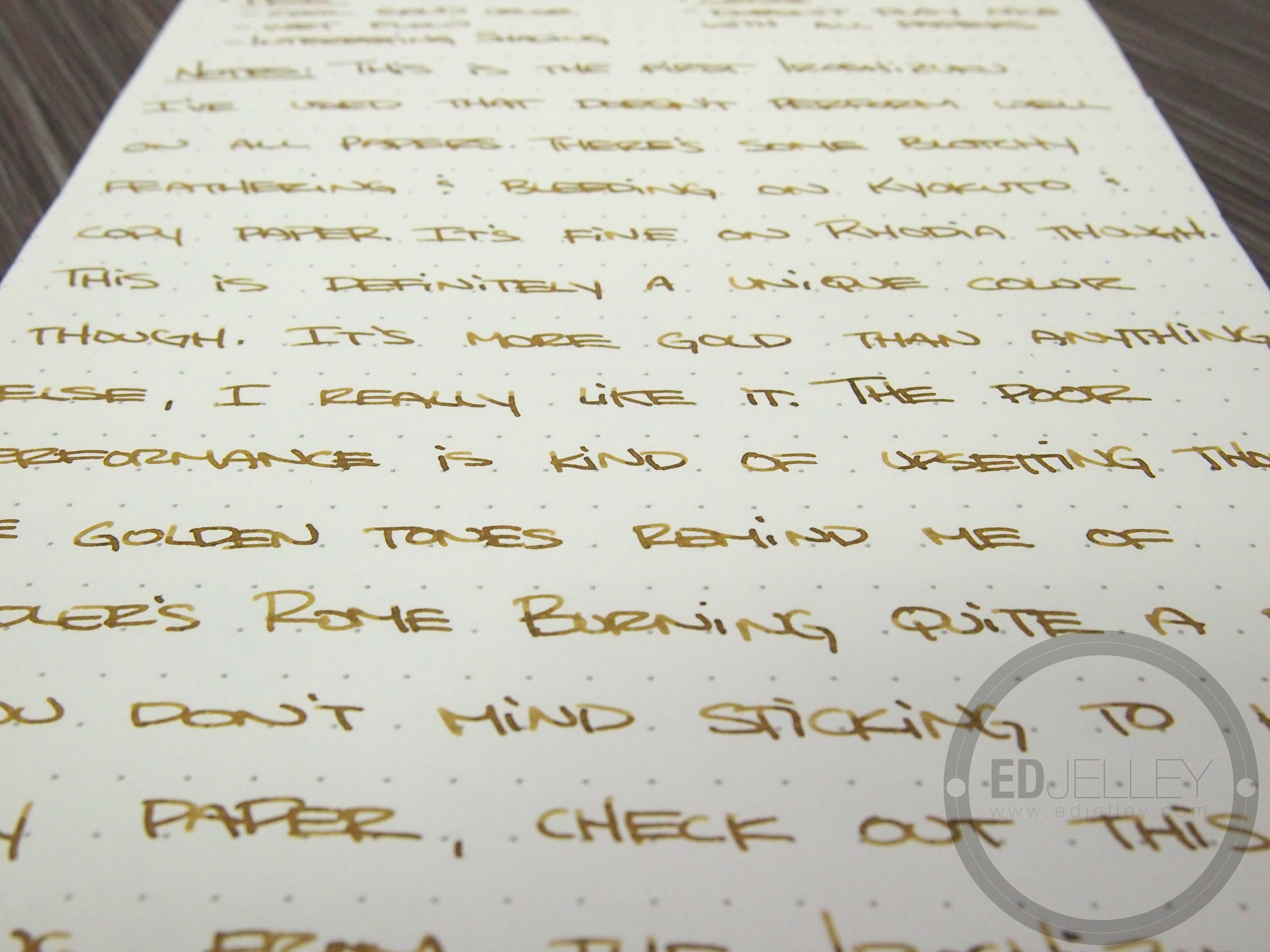 This is the first ink from Iroshizuku I’ve used that doesn’t perform well on all papers. There’s some blotchy feathering and bleeding on my standard ink review paper (Kyokuto FOB COOP) and it gets even worse on regular copy paper. It does play nice with Rhodia though. Other than the performance of the ink, it’s a really interesting color. Ina-ho means “rice ear”, it’s a nice shade of medium gold. It manages to look gold rather than yellow and there’s some interesting  texturing where the ink and paper meet. I really like the color, but its performance is somewhat prohibitive. The gold tones remind me of Noodler’s Rome Burning quite a bit, but hopefully this ink cleans out of the pen a little easier. If you don’t mind sticking to Rhodia, check this one out. It’s a really enjoyable color as long as the paper quality is good. Overall, I was slightly underwhelmed, considering the rest of the Iroshizuku line performs wonderfully.