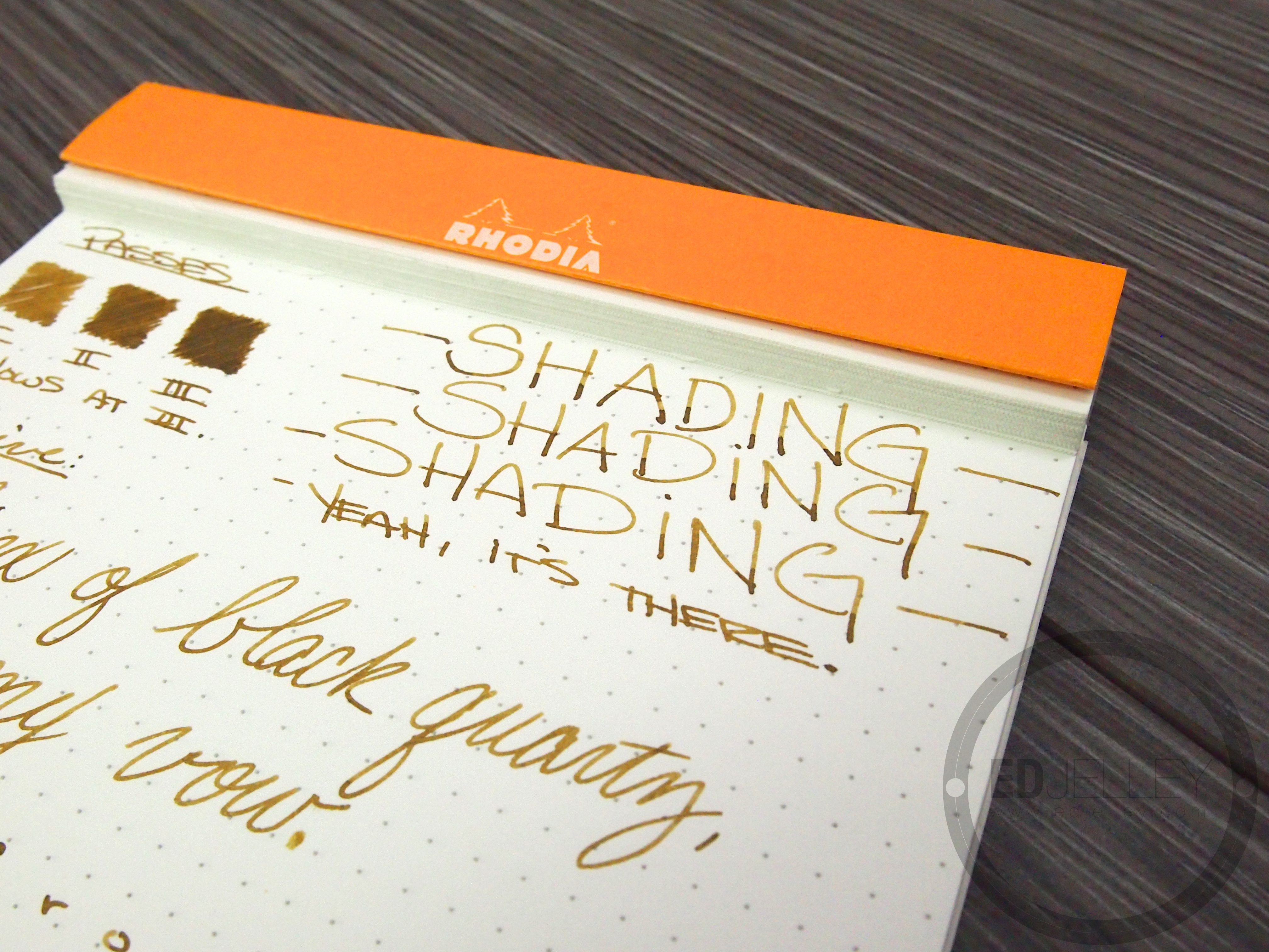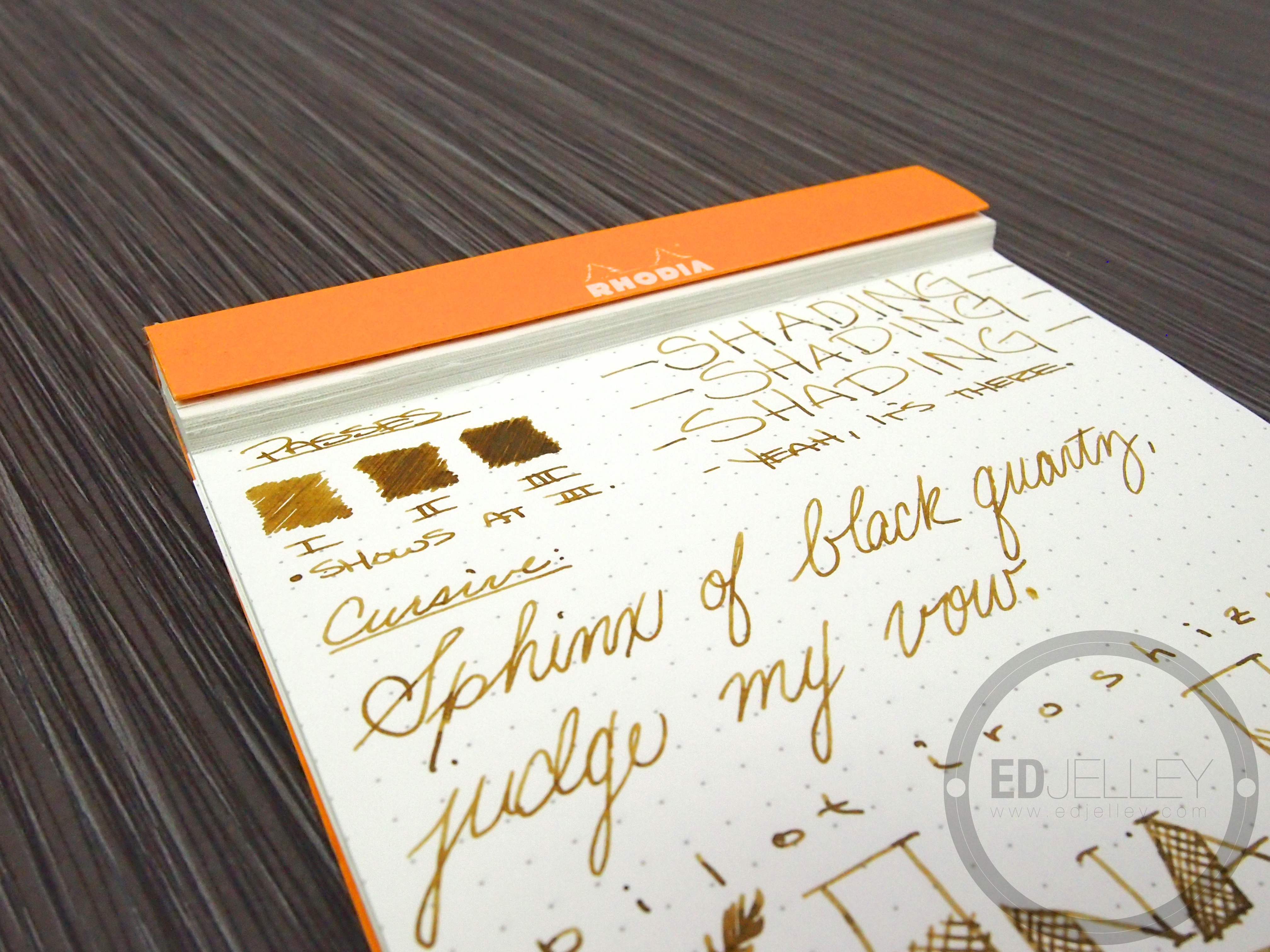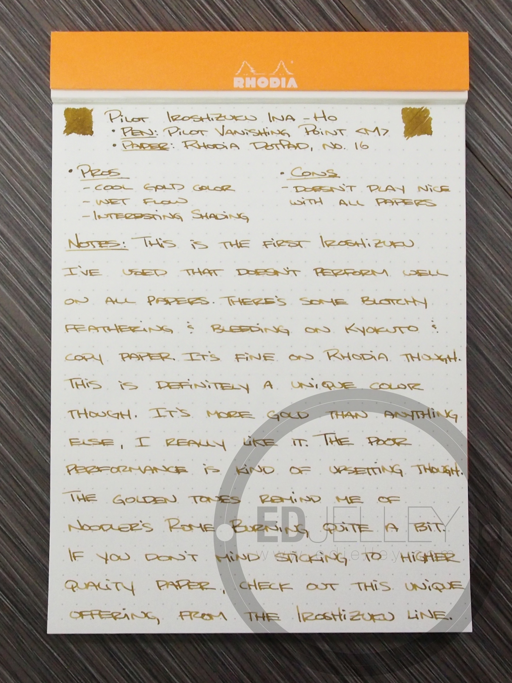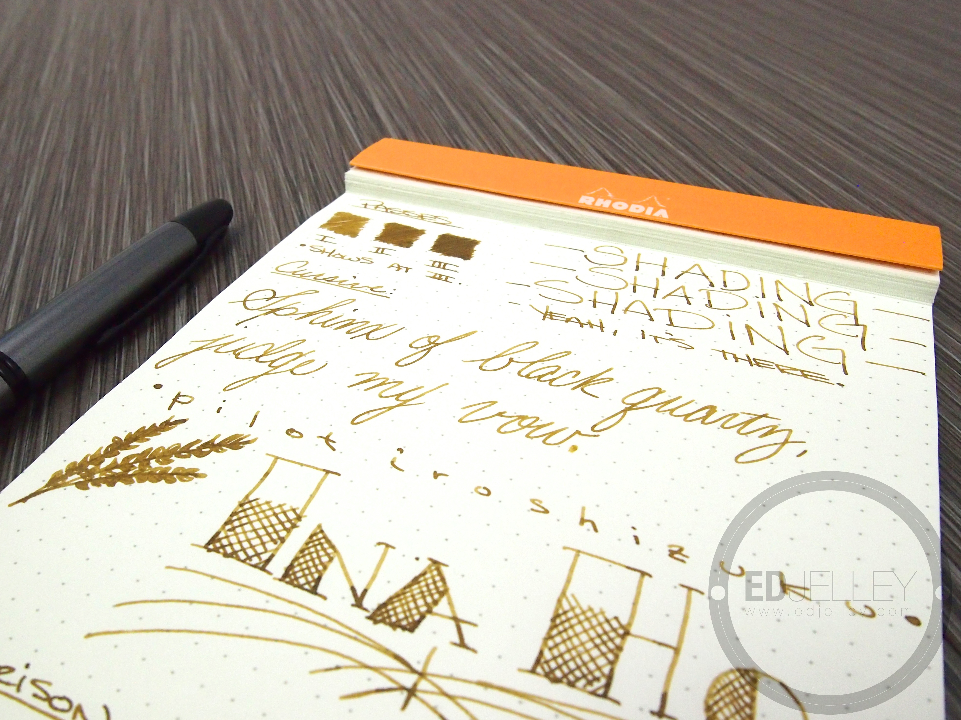 This is the first ink from Iroshizuku I’ve used that doesn’t perform well on all papers. There’s some blotchy feathering and bleeding on my standard ink review paper (Kyokuto FOB COOP) and it gets even worse on regular copy paper. It does play nice with Rhodia though. Other than the performance of the ink, it’s a really interesting color. Ina-ho means “rice ear”, it’s a nice shade of medium gold. It manages to look gold rather than yellow and there’s some interesting  texturing where the ink and paper meet. I really like the color, but its performance is somewhat prohibitive. The gold tones remind me of Noodler’s Rome Burning quite a bit, but hopefully this ink cleans out of the pen a little easier. If you don’t mind sticking to Rhodia, check this one out. It’s a really enjoyable color as long as the paper quality is good. Overall, I was slightly underwhelmed, considering the rest of the Iroshizuku line performs wonderfully.