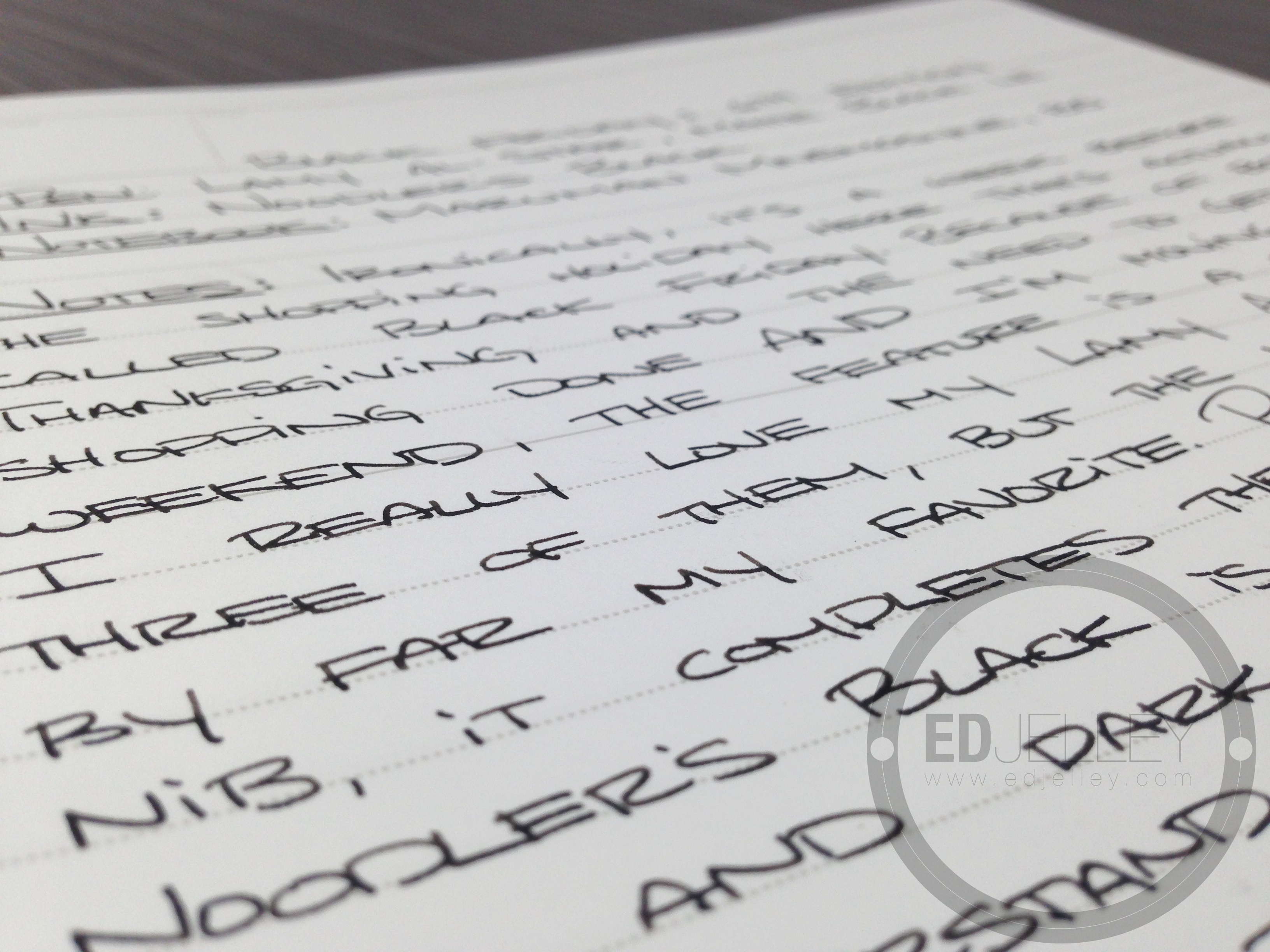 I really love my Lamy AL-Star. I have three of them, but the matte black limited edition is by far my favorite. Paired with a black nib, it completes the total stealth look. The second they became available, I picked one up. The Noodler’s Black is a great ink. It’s solid, dark, smooth, and water resistant. I completely understand why it’s the go-to black ink for so many people. Last, but not least, is the Maruman Mnemosyne notebook in B5. These notebooks got me through my last two years of school. I love the size, paper, and ruling. The textured black cover and the black wire binding make the notebook an ideal candidate for a Black Friday feature.