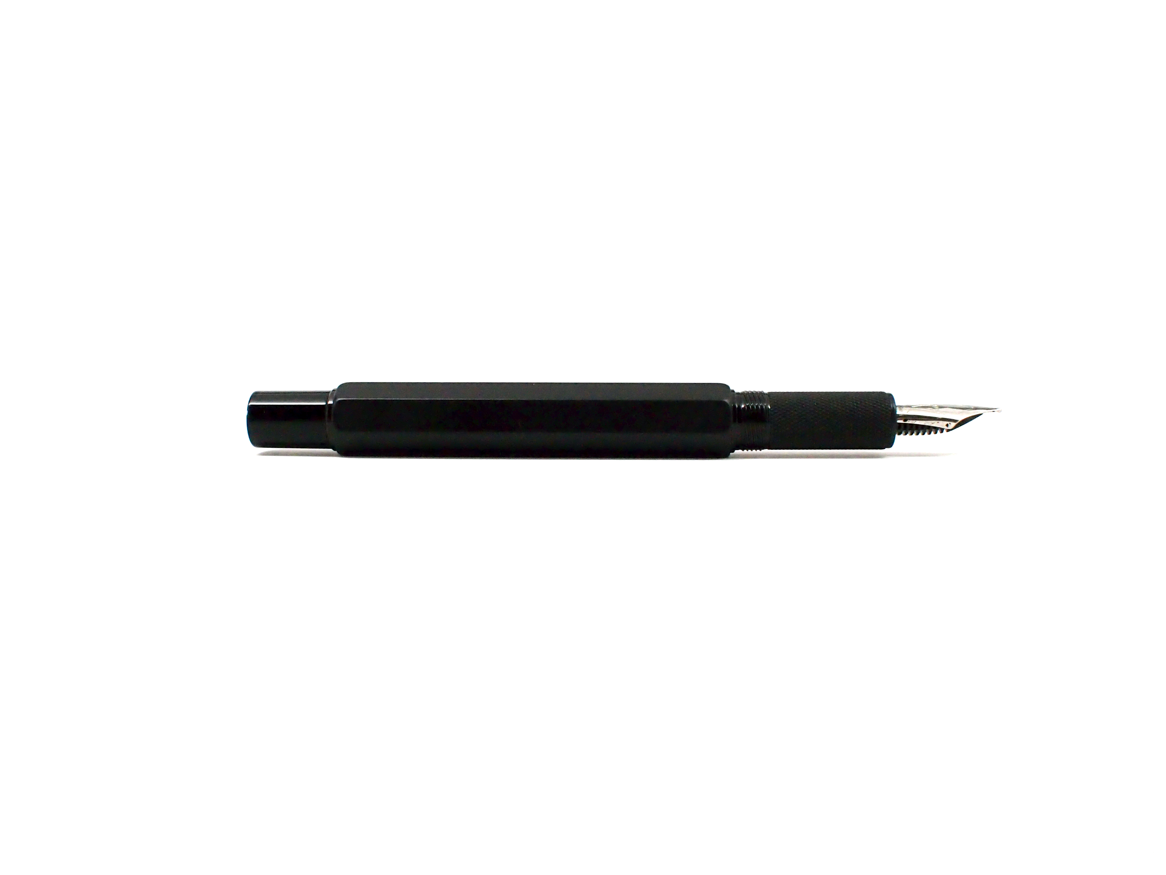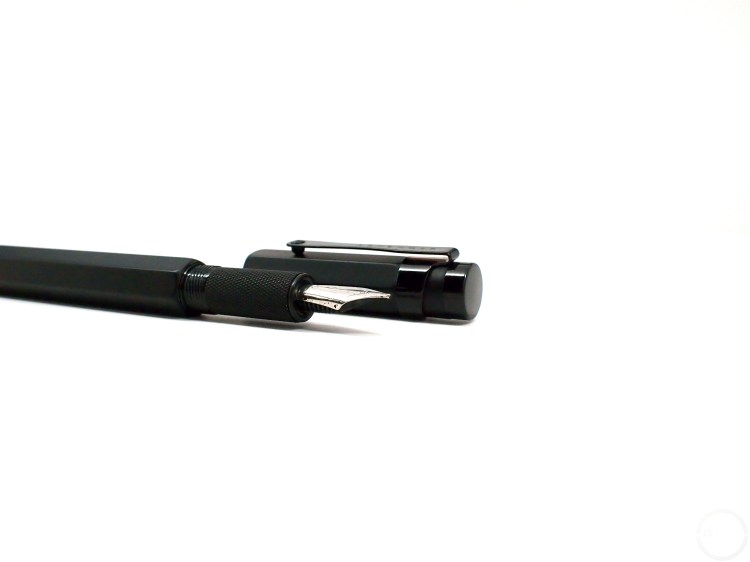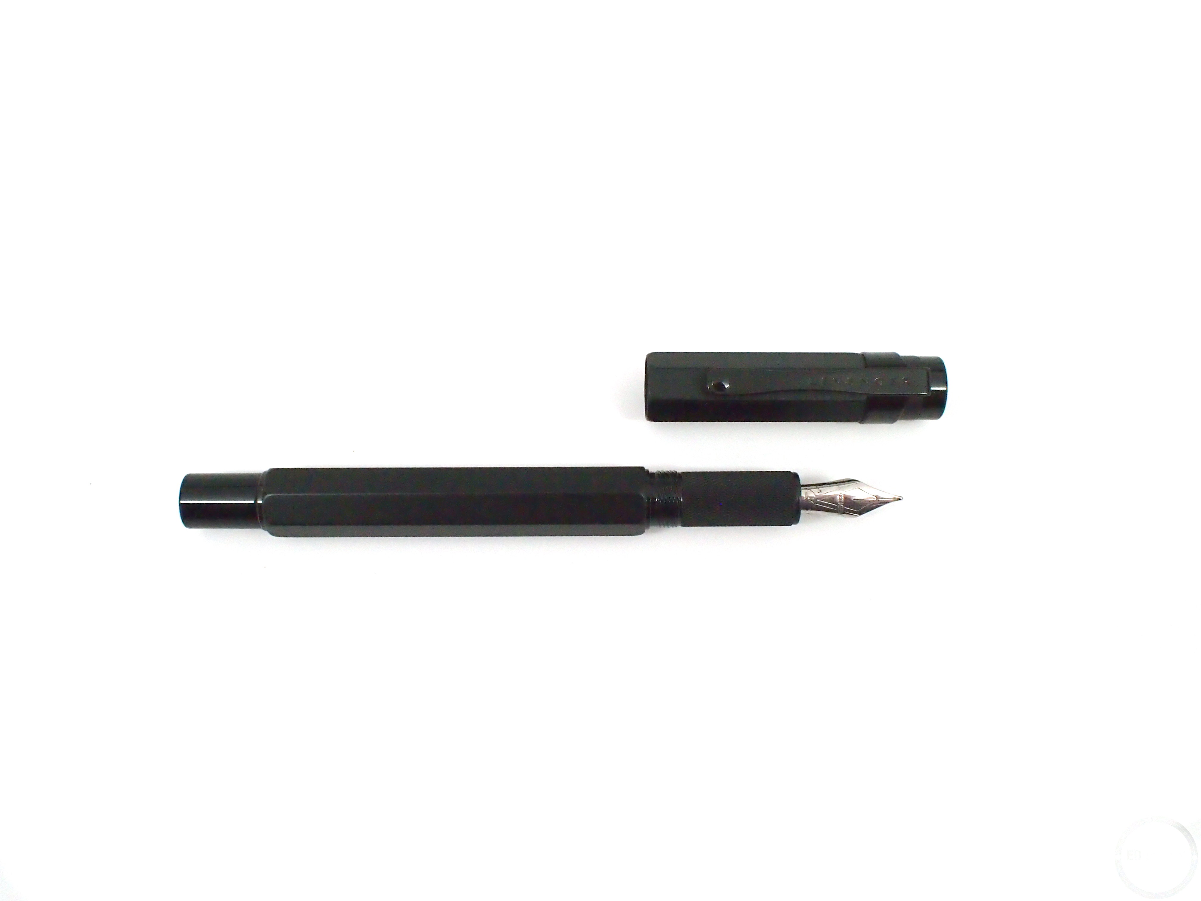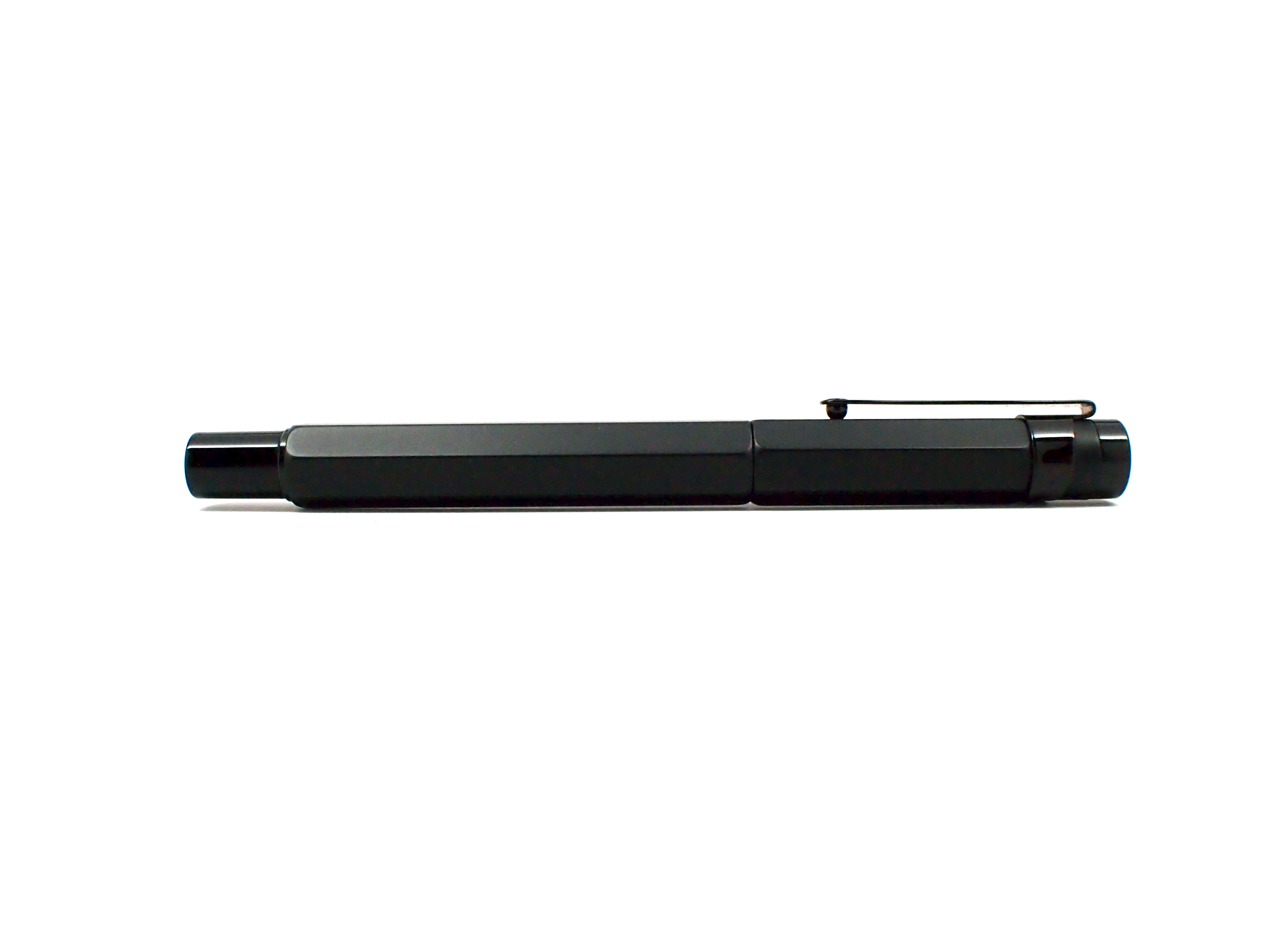 The mix of matte and gloss black adds dimension and gives the pen some character. The tail section of the pen, the clip, the grip and top of the cap are all high gloss. It’s a classy looking pen that would look at home on a desk or on a production floor. The 7-sided body is like a beefed up Rotring with an extra side. It’s a bit wider and heavier than my Newton (600?) Lava.