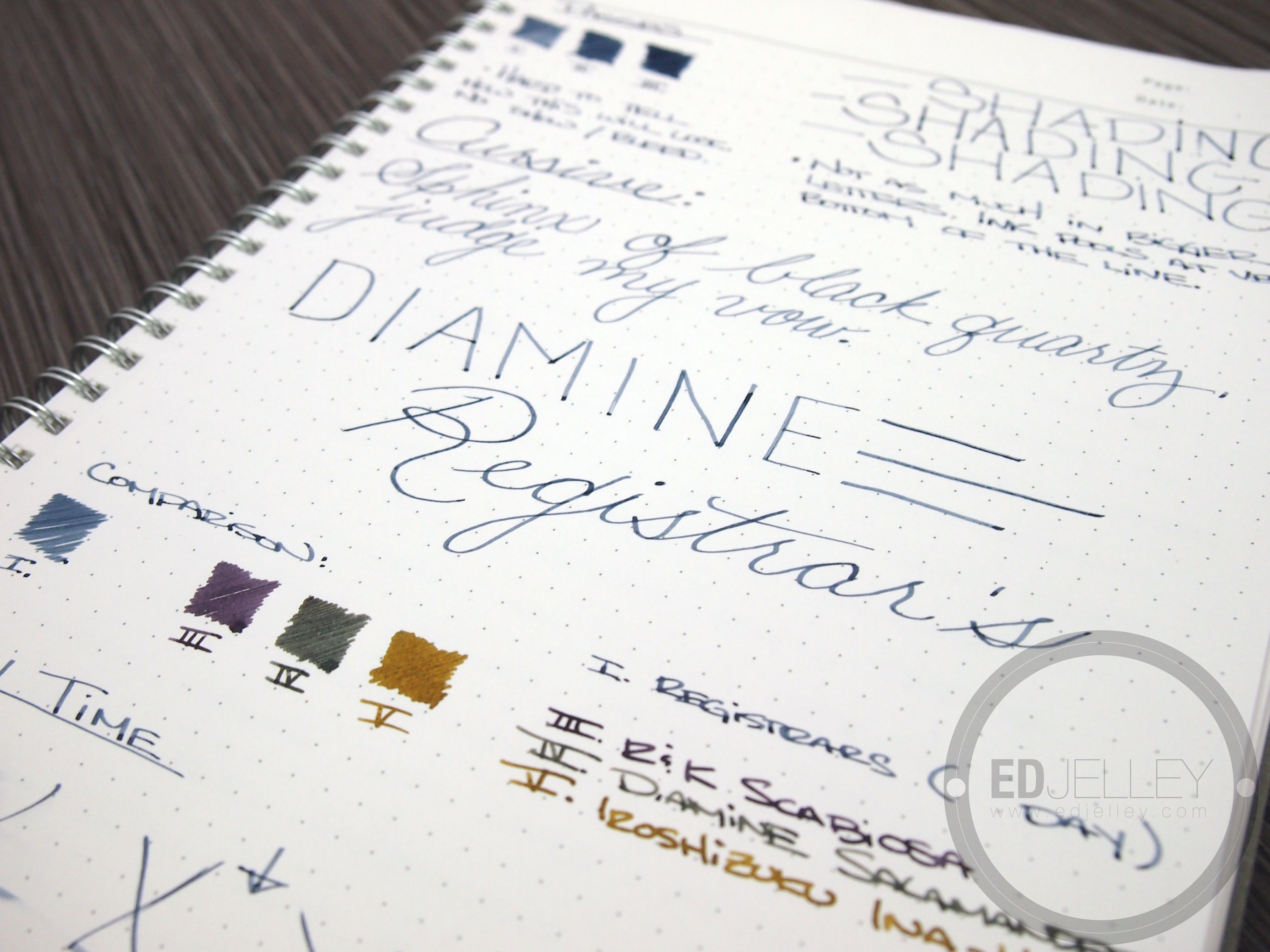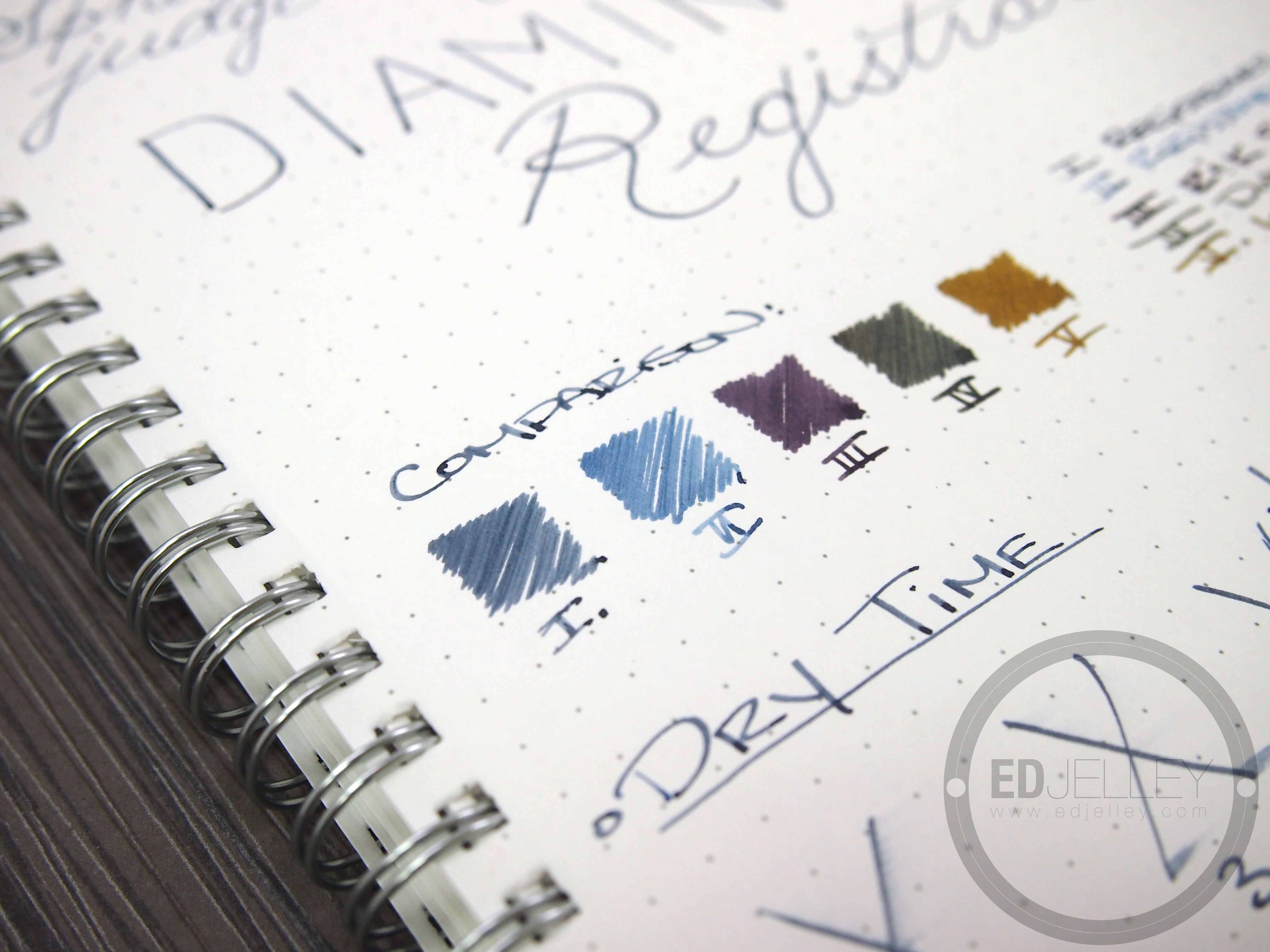 At the time of writing, I was on a bit of an Iron Gall kick. First I fell in love with Rohrer & Klingner Scabiosa, now I’m enjoying the Registrar’s, and I have a sample vial of R&K Salix waiting to be loaded up. The most interesting thing about this ink is how it dries from a pale dusty blue to a deep blue-black as the ink oxidizes. The ink comes out of the pen as a light blue with some nice shading, check back in 24 hours and it’s super dark. The ink behaves well on the Kyokuto paper, Rhodia, copy paper, and Field Notes. It’s a great ink to have around due to it’s versatility. I’ve really been enjoying watching the transition from light blue to near-black. My only issue with the ink is how dry it writes. This would be best suited in a wet flowing pen. Overall, I think the positives outweigh the negatives. The real test is going to be how the Diamine holds up to Rohrer & Klingner’s blue iron gall offering.
