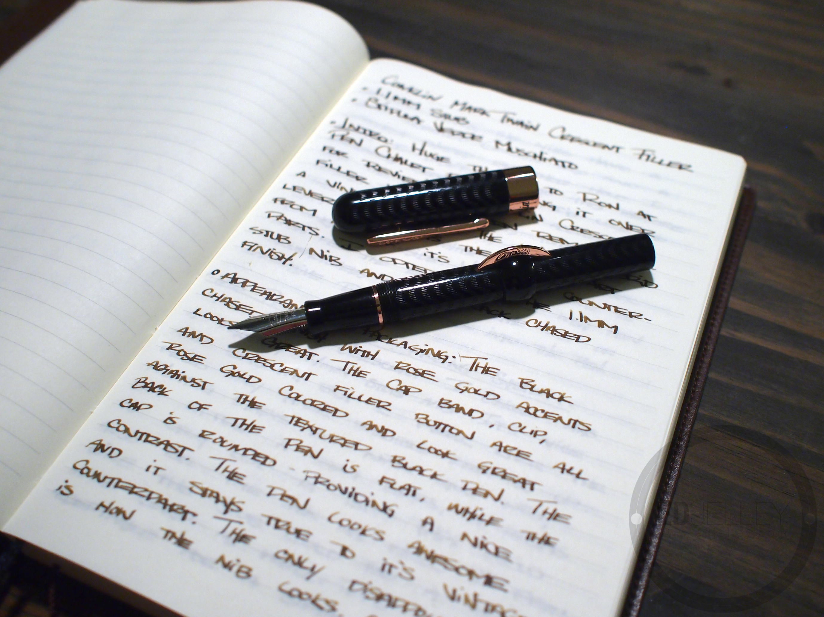Thank you. I know this is an older review, but I just purchased and am awaiting a NIB Conklin Mark Twain (Fine) Black Chased Gold… super excited to ink it up. I’m a relative noob amongst sages and I realize that my collection and utilization are far different than many. I’m primarily a low range (<$200) price point primarily F/EF 'user' [except for addressing, signing, acarss, and some letters] who writes all over everything all the time to handle/manage some bad aphasia as a result of two strokes and a traumatic brain injury. I'm never without one or two pens on me and write on everything from the ever present 5"x8" cards (gasp) I use religiously, birthday/thank you cards, lists, journaling in midori/rhodia/mokeskine notebooks, bible study, writing in margins of books, and an average of 5 love letters a week to my bride of 21 years. I swap colors a lot, except for my TWSBI workhorses which stay full of Noodler's Heart of Darkness. It's all the others that get used for letters a what not. I'm quite the Noodler's Nut, but have a pretty broad pallets to experiment. As I prefer something with water resistant qualities. I'be read that it's a wet one or a dry one, and pens vary even within model, but has you dialed in an ink you really like in this. (BTW; my writing is typically on what most would consider the small side).
