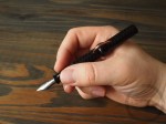 The Conklin Crescent Filler is a solid feeling pen. The grip is smooth and comfortable. The chased black finish adds some nice tactile feel to the pen, which is a welcomed touch. The crescent filler itself is solidly seated in the pen, with no wiggle or give. The spring loaded clip is nice and sturdy as well. The only potential issue I could see is the position of the bead that locks the crescent filler in place. When writing, it hits just in the spot where my thumb and index finger meet. It’s not uncomfortable, but some may find it to be a bit intrusive. The pen is capable of posting, but the cap is heavy and it makes the pen too long and too back-heavy for me to comfortably write. The pen is already a good size for me without posting, so for me it’s not necessary. The chasing on the pen adds some, but not too much texture. It’s definitely in the middle of the road as far as weight goes – being 19g with some ink in it.