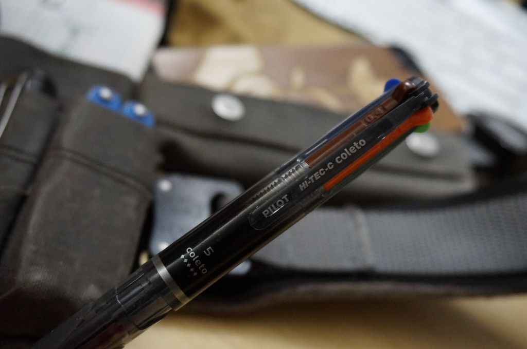 I usually keep a Pilot Coleto in the belt (blue, green, orange, brown and black) but they break easy at the job site. In the tool back I try to keep a Staedtler Triliner business set which is a fantastic way took keep a good set of EDC pens safe and secure. I always try to have a ball point around just in case someone needs to borrow one.