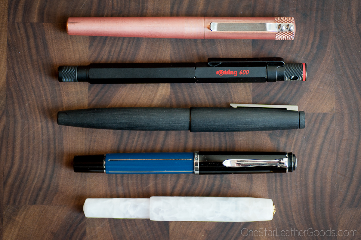 First thing’s first, I think I need that table/cutting board/whatever that background is. It really shows off the pens nicely. I really like that you keep it down to a few pens, but each one is special. The Karas Render K is great for when a fountain pen just can’t do the job. They’re all classic looking pens, nothing too trendy, and you could definitely continue to carry these 5 for decades without ever needing any more. Richard Binder does some great work, I’m sure the nib on that Pelikan is out of control. Great pictures, and great pens, thanks Keegan!