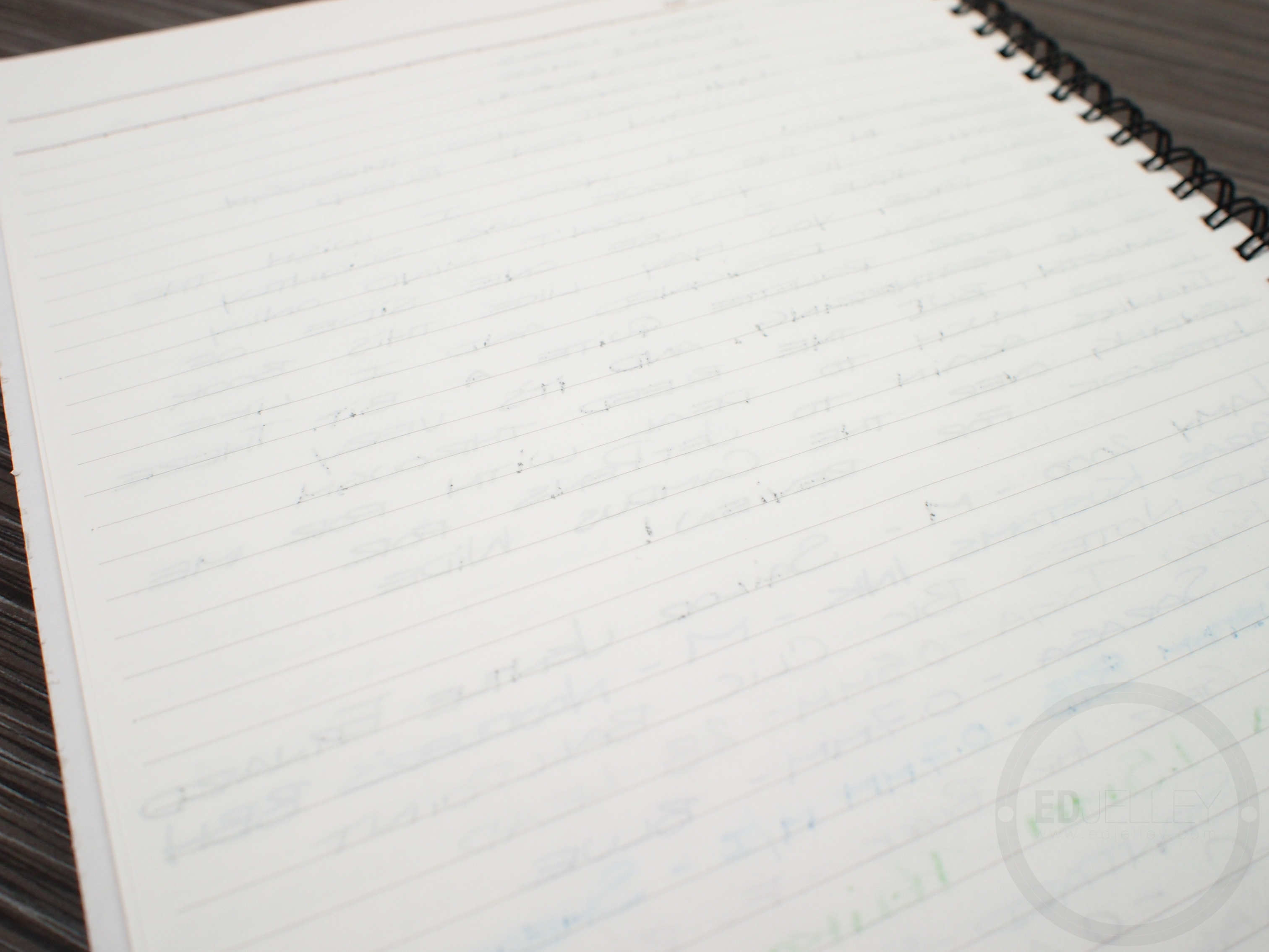 The 70g off-white paper is smooth, but it’s having quite the show through problem. There’s no feathering and ink dries on the page pretty quick. I imagine an extra fine nib would work okay, but if you’re using the paper to take notes with a fountain pen, you might not have the best time. This paper would definitely be better suited to gel or ballpoint pens (or any other non-liquid based ink).