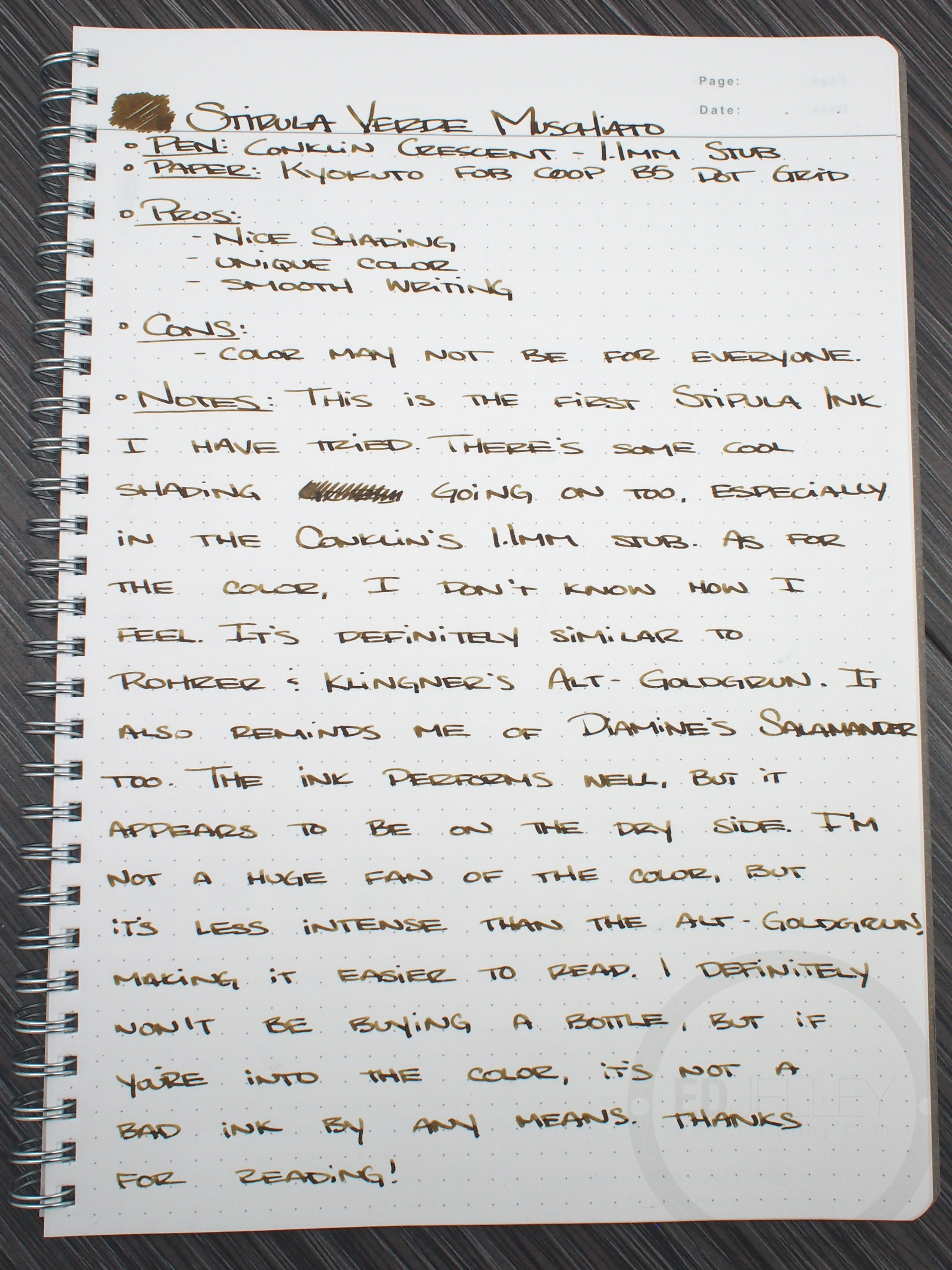 Notes: This is the first Stipula ink I have tried. First impression is that there’s some really cool shading going on, especially in the Conklin’s 1.1mm stub nib. As for the color itself, I don’t know how I feel about it. It’s definitely reminding me of Rohrer & Klingner’s Alt-Goldgrun and Diamine’s Salamander. The ink performs well, but it’s slightly on the dry side. I’m not a huge fan of the color, but it’s definitely less intense than the Alt-Goldgrun, which makes it easier to read. I definitely won’t be buying a bottle, but if you’re into the color, it’s not a bad ink by any means. Thanks for reading! This ink was also part of the awesome ink sample package that Azizah at GourmetPens.com sent over a few months back – so thanks again!