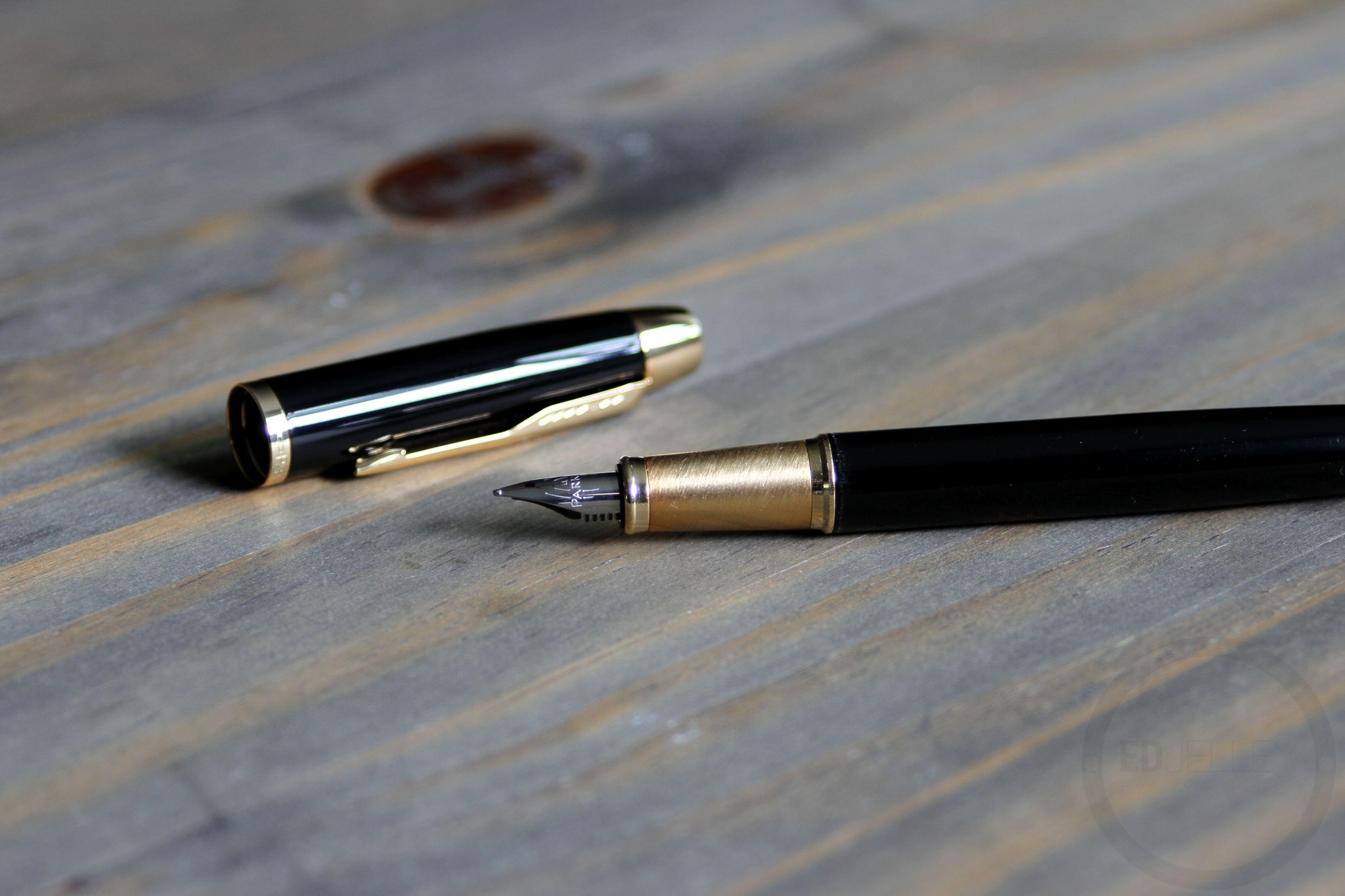 The IM comes in a nice gift box. This is a nice touch, especially for a sub-$30 pen. It would definitely make a nice gift for a new fountain pen user. The pen has a classic black an gold color scheme and a modest, unassuming shape. The pen is at the upper end of the beginner fountain pen price range, but it doesn’t feel cheap at all. I particularly like the brushed metal grip and the contrast it provides against the shiny metal rings on the pen above and below the brushed section. The cap has a nice weight and is adorned with the classic Parker arrow-shaped clip. It’s a great looking pen and feels great too.