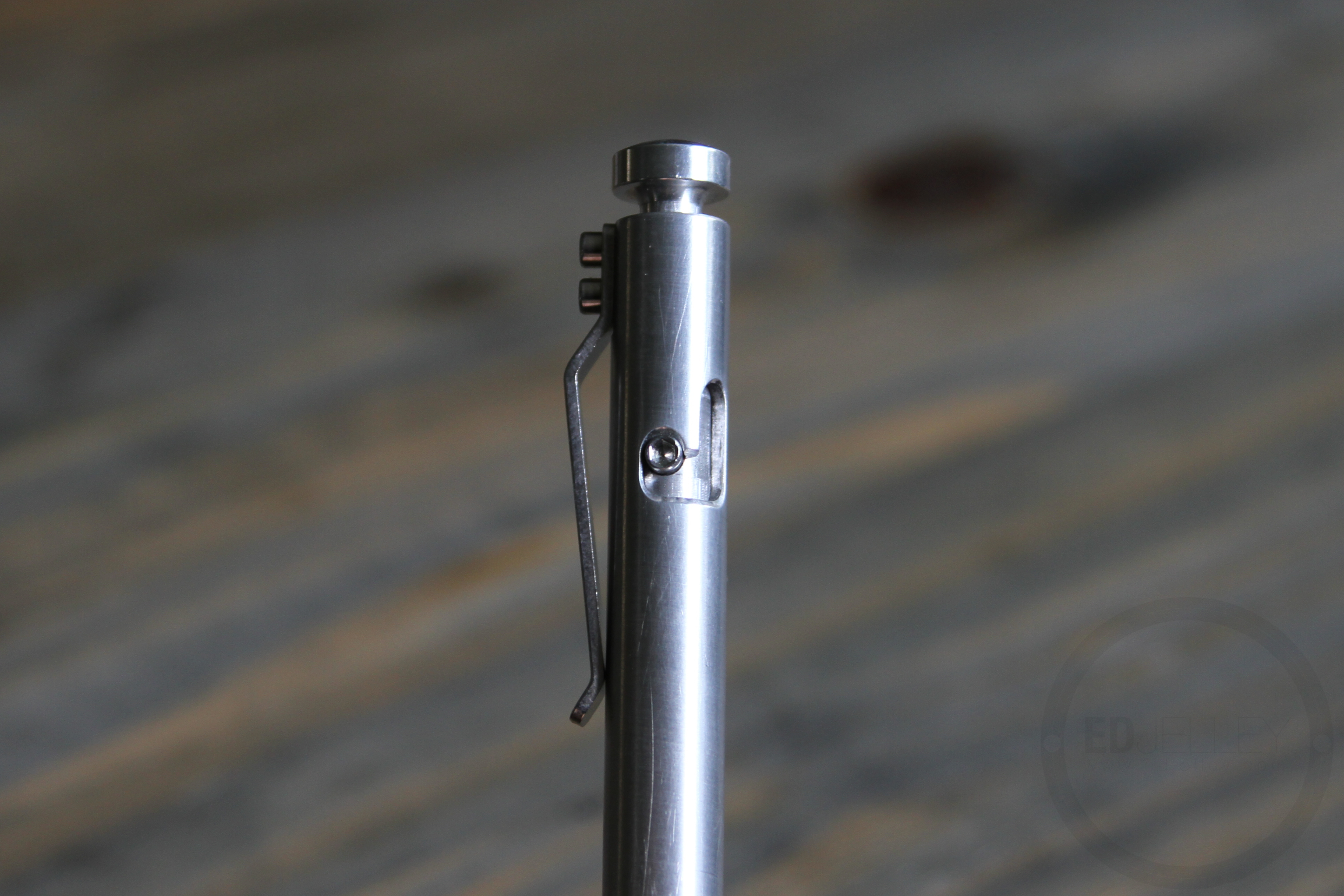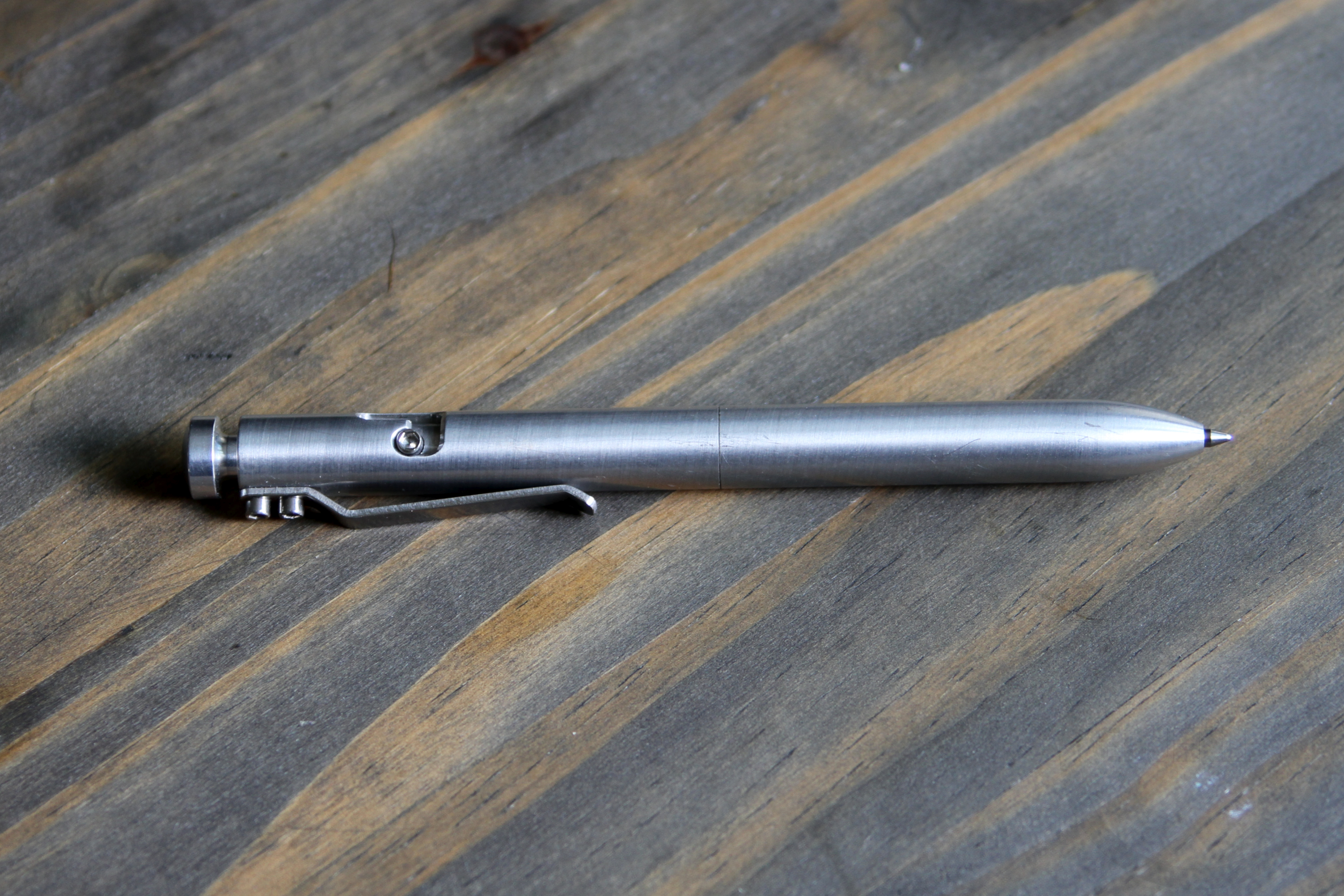 The Bolt is a really sleek-looking pen. The brushed aluminum surface looks and feels great in hand. The bolt-action groove in the barrel gives you something to look at, breaking up the smooth surface. The knock needs to be pushed down and twisted to lock into place to engage the refill. I particularly like how the knock tapers from the bottom of the “button” into the top of the pen. It’s a small detail, but it adds to the overall look of the pen. The clip is secured by two hex bolts and has some really serious grip strength. The pen is built like a tank, I’m sure it can withstand any abuse you can throw at it. The pristine brushed finish is not indestructible though. After carrying it around in my pocket with keys, change, a knife, and whatever else I may throw in there, there are some visible scratches. I like the added character, but if you’re one of those people who needs everything clean and perfect, take note.