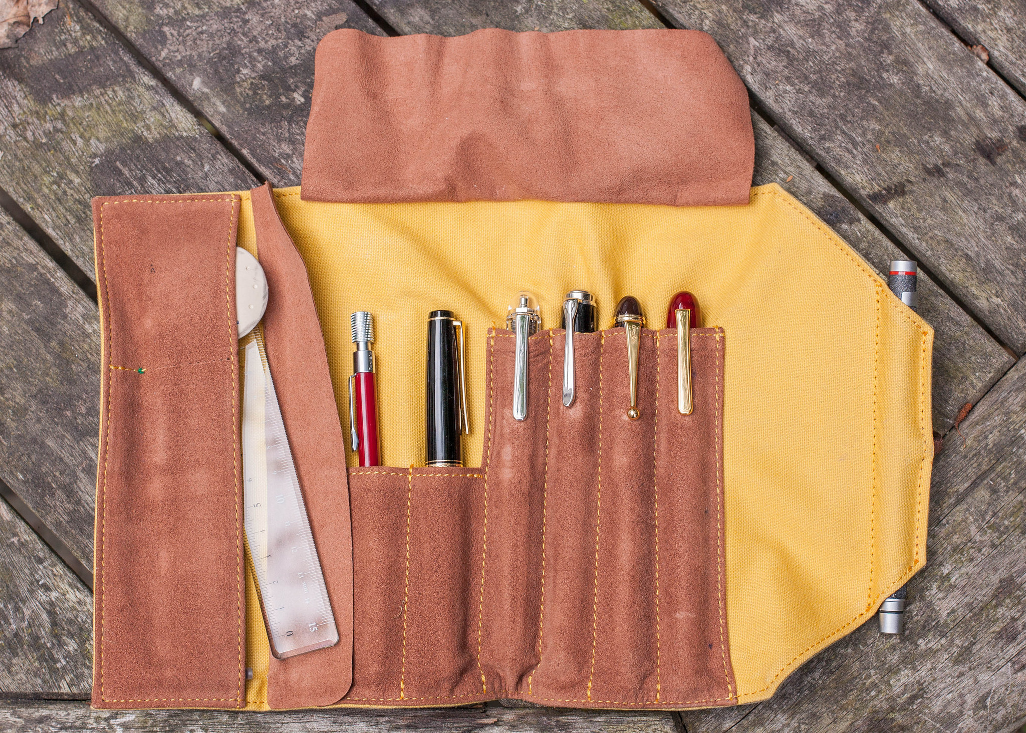 * Rotring 600 Lava rollerball on the outside of the case so it’s easy to grab.
