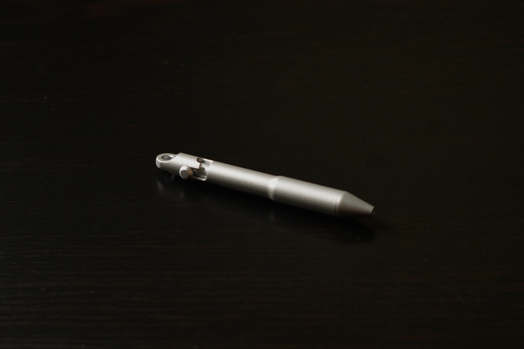 The Move is small. It’s supposed to be small. It’s not much longer than a standard key, but it’s still shorter than my Honda car key. It’s made of metal, and hard-anodized with a slightly textured finish. The pen has a bulge towards the front to improve grip and the small bolt action mechanism protrudes slightly from the side. The pen is very well constructed and designed, with o-rings to keep parts from unscrewing, and tight tolerances. It’s fairly obvious that a lot of thought went into the design of the pen. It’s minimal, yet big enough to jot down some notes with. The pen attaches to a keyring easily via the small integrated loop at the top of the pen. The material is thick enough at the top to where I don’t have to worry about it snapping off and getting lost.
