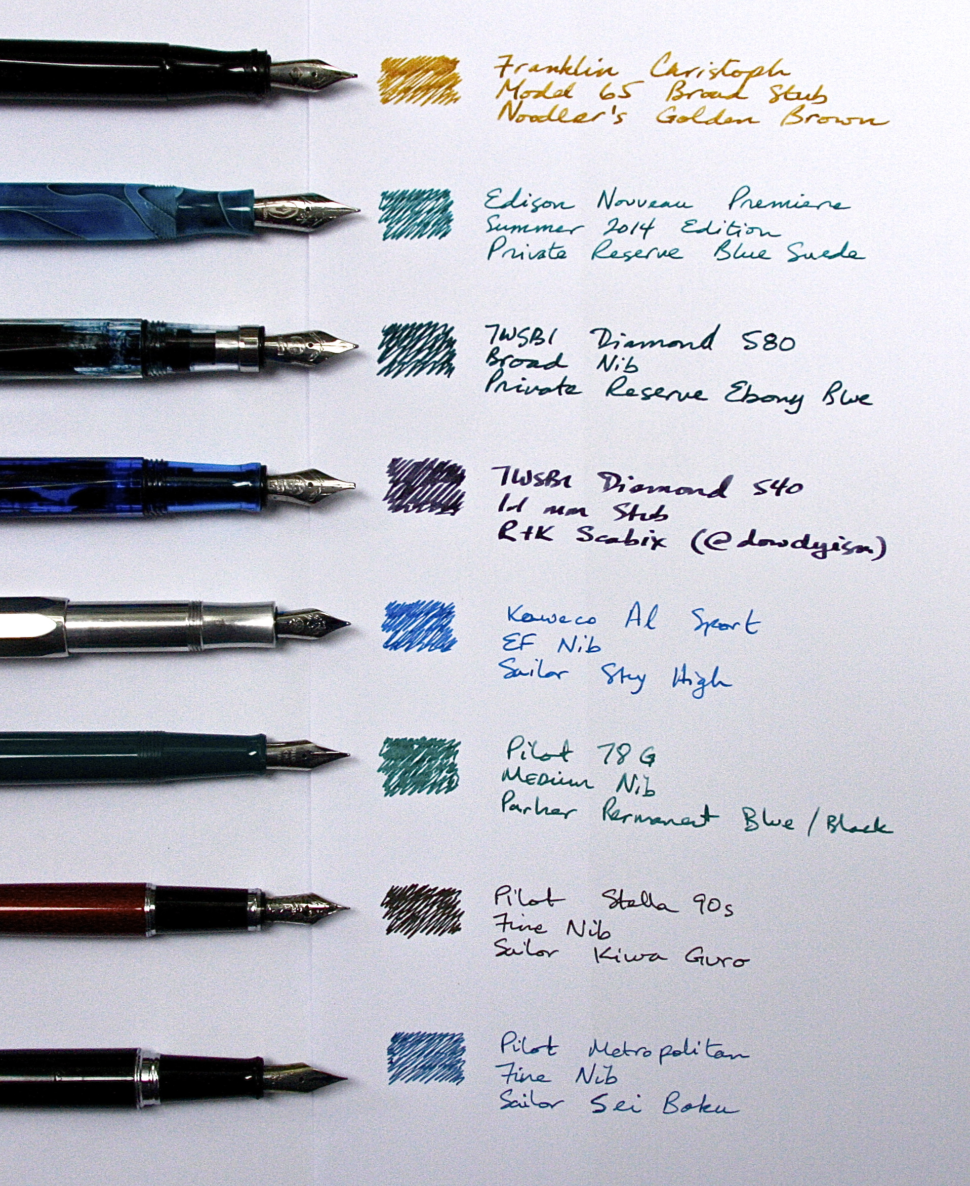 These are the pens that I am using for journalling and correspondence writing. In general, I choose inks that display some shading or have a sheen when dry. While this is not the case for all of the inks loaded, the first three are all good shaders.