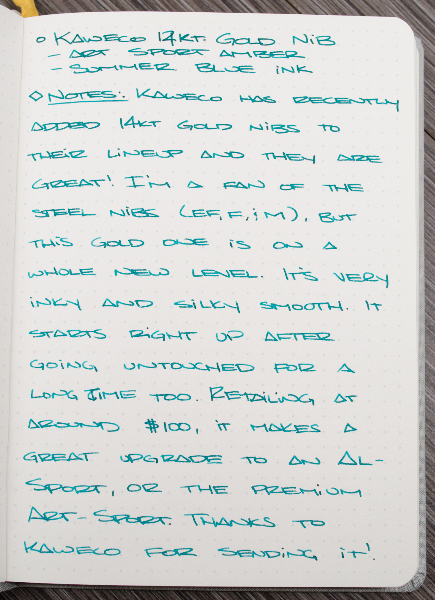 Notes: Kaweco has recently added 14k gold nibs to their lineup and they are great! I’m a fan of their steel nibs (EF, F, and M – nothing bigger) but this gold nib is on a whole new level. It’s got great ink flow and it is silky smooth. It starts right up, even after being unused for weeks. Retailing at around $100, it makes a great upgrade for an AL or ART Sport – adding a premium look, feel, and writing experience. This is definitely one of the better stock gold nibs I’ve used. If you’re a Kaweco fan, consider adding one to your collection. The newest Kawecos all have easily interchangeable nibs, so you can swap this one in and out easily. Thank you to Sebastian over at Kaweco for sending the nib to check out!