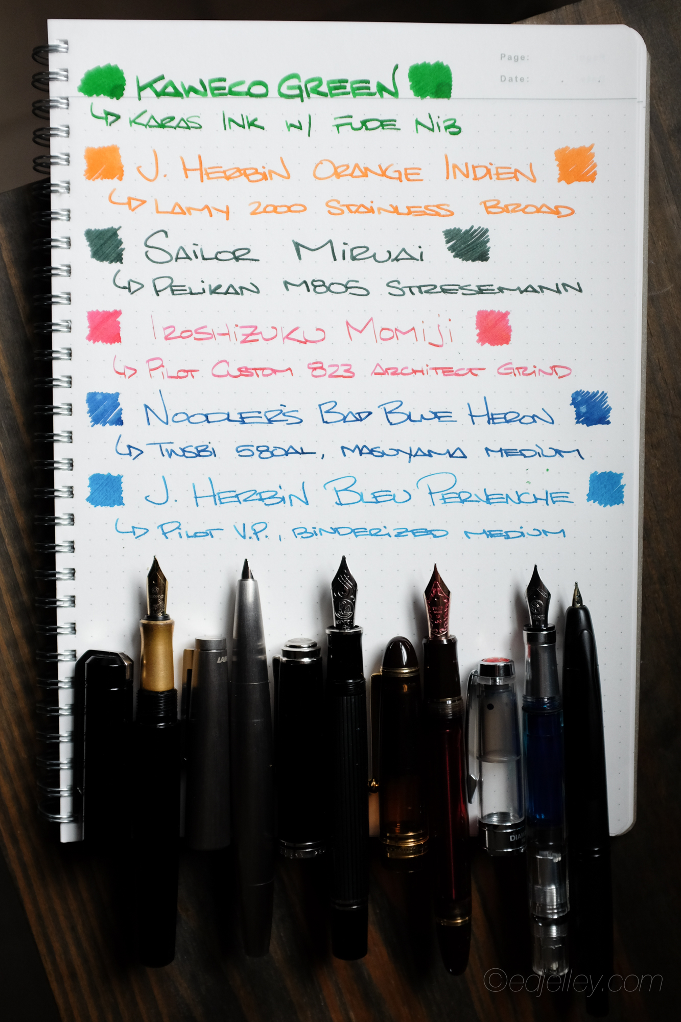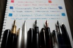 Notes: It’s been a while since I’ve done one of these and there are a lot of new things here. Also a few things I’ve had for a while but haven’t gotten around to reviewing yet. I just figured out that the Hero 9018 fude nib fits into the Karas Kustoms Ink and I’m having a lot of fun with that. I recently picked up the Lamy 2000 and the Pelikan M805 so those two are being put through their paces for official reviews – expect those soon! The Pilot 823 is almost always inked up, the architect point is so fun to use. I haven’t emptied out the 580AL in a while, no problems with the ink and no visible staining, which is nice. I’m not huge on this pen, but somehow it’s managed to stick around. I filled the Vanishing Point with the JH ink to do a review, it’s just about empty so it will be back in storage soon.