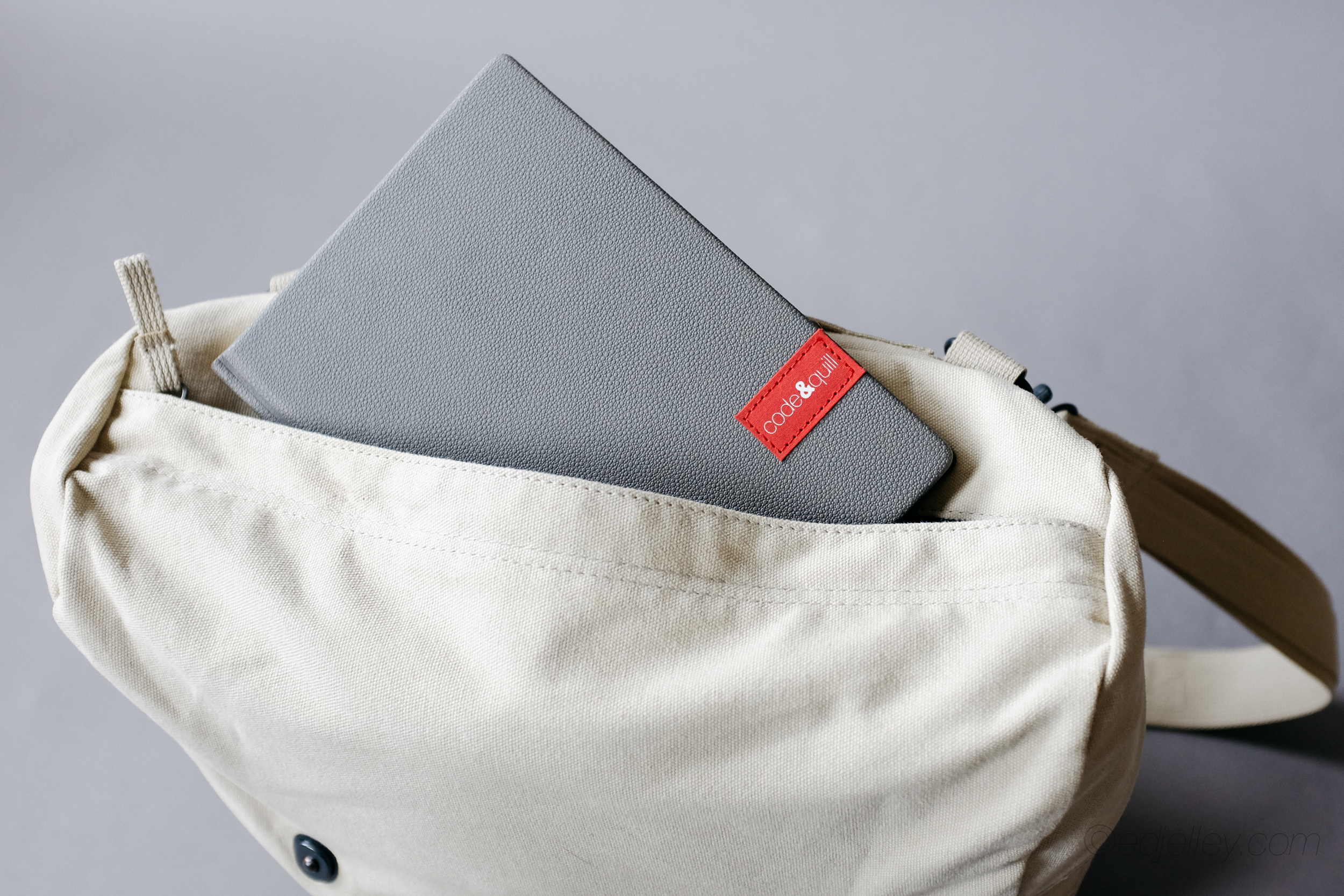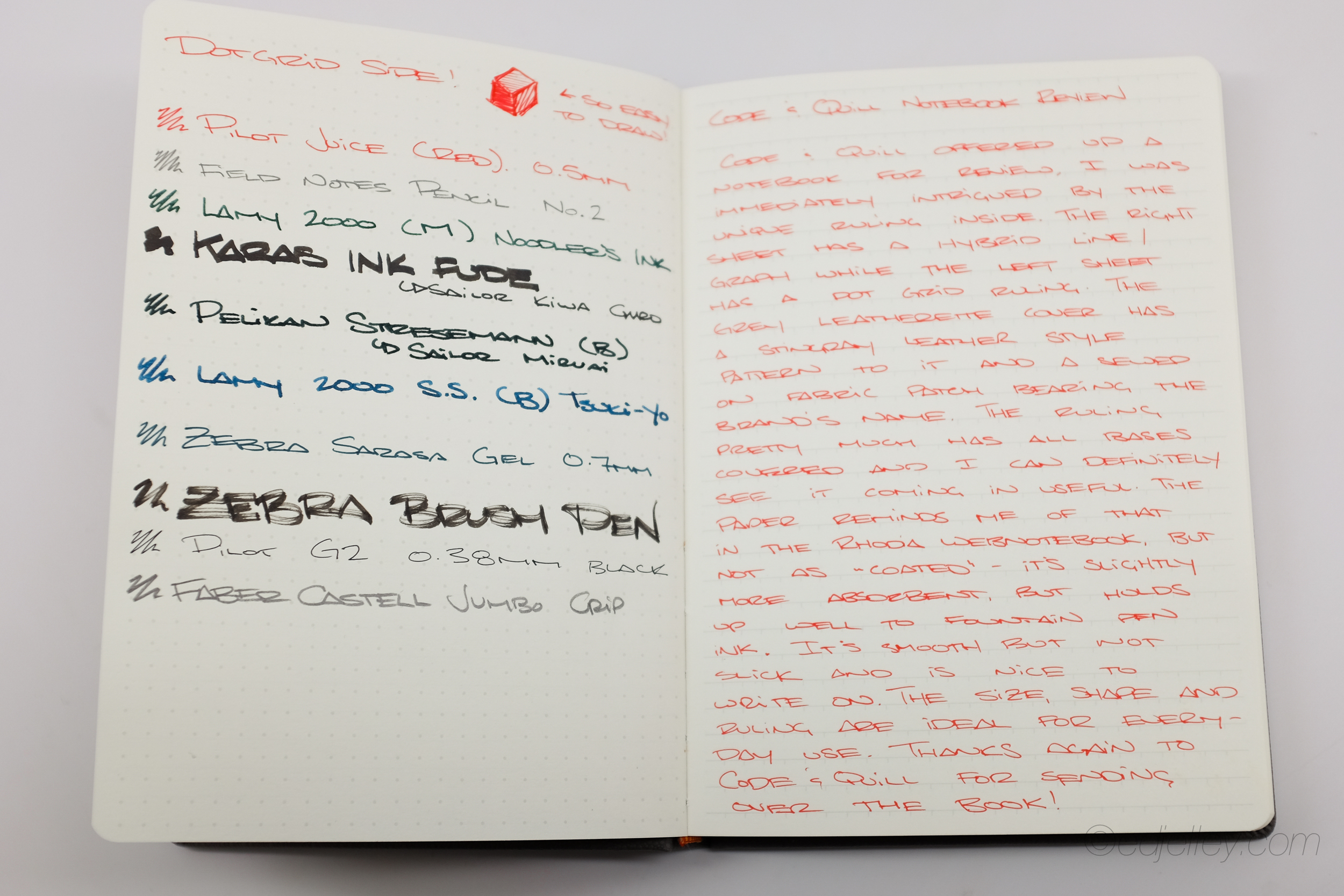 The grey leatherette cover is nicely textured, it reminded me of stingray leather’s pattern. There’s minimal branding, but I like how it is done. Code & Quill have sewn on a fabric patch with their logo on the front of each book. The ruling inside pretty much has all of the bases covered for anything you want to write or sketch – thanks to the lines, grid, and dots. I can definitely see the layout being useful. The paper inside reminds me of that which is found in the Rhodia Webnotebook. It’s slightly heavier at 100GSM, but retains a similar off-white color.