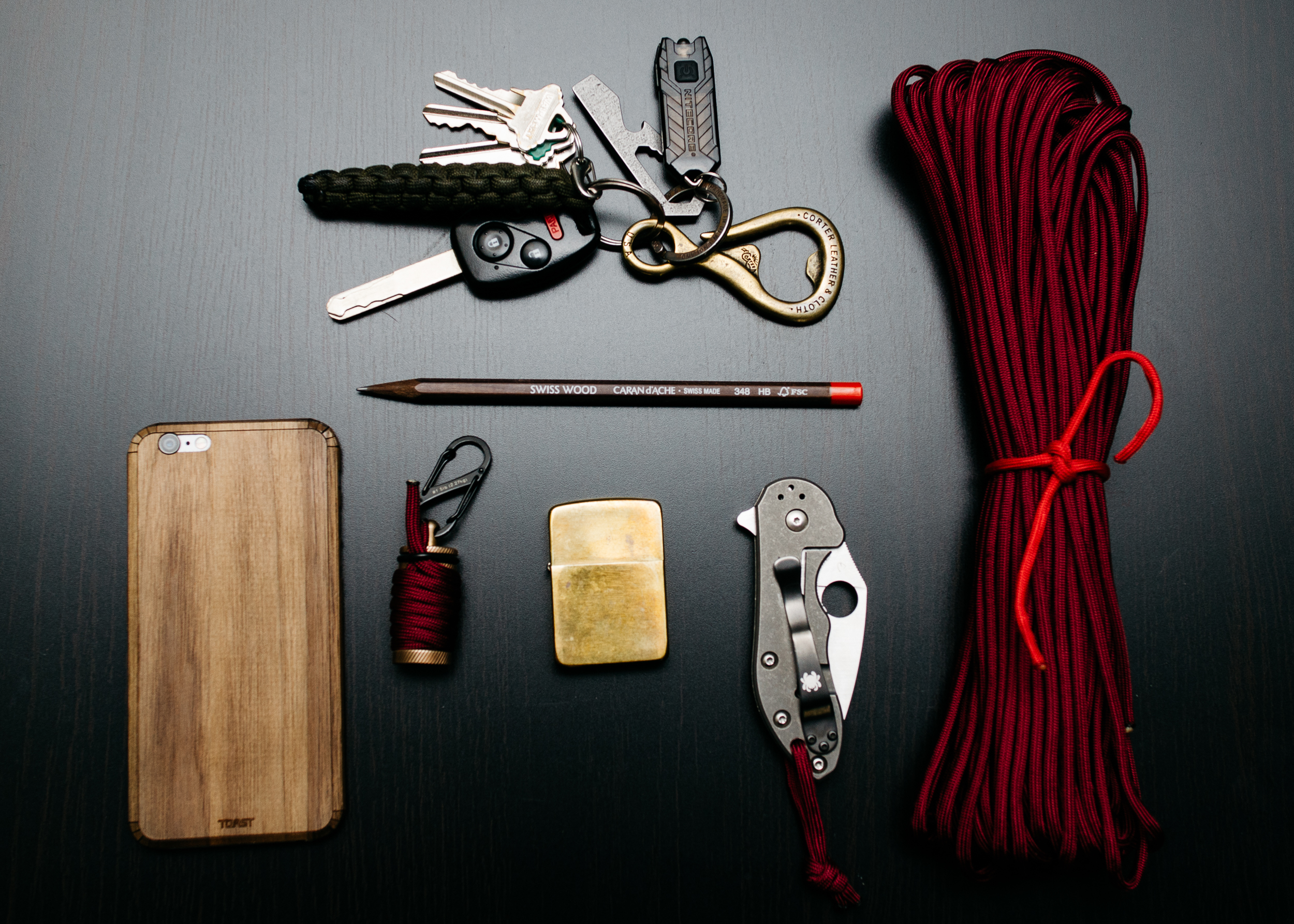 Bonus pic: my key setup and a closeup of my phone. I carry a lighter (I don’t smoke) just in case and another small flashlight on my keychain. The paracord isn’t with me every day, but a small length of it is right at home on my Peter Atwood Roll Bar in Bronze.