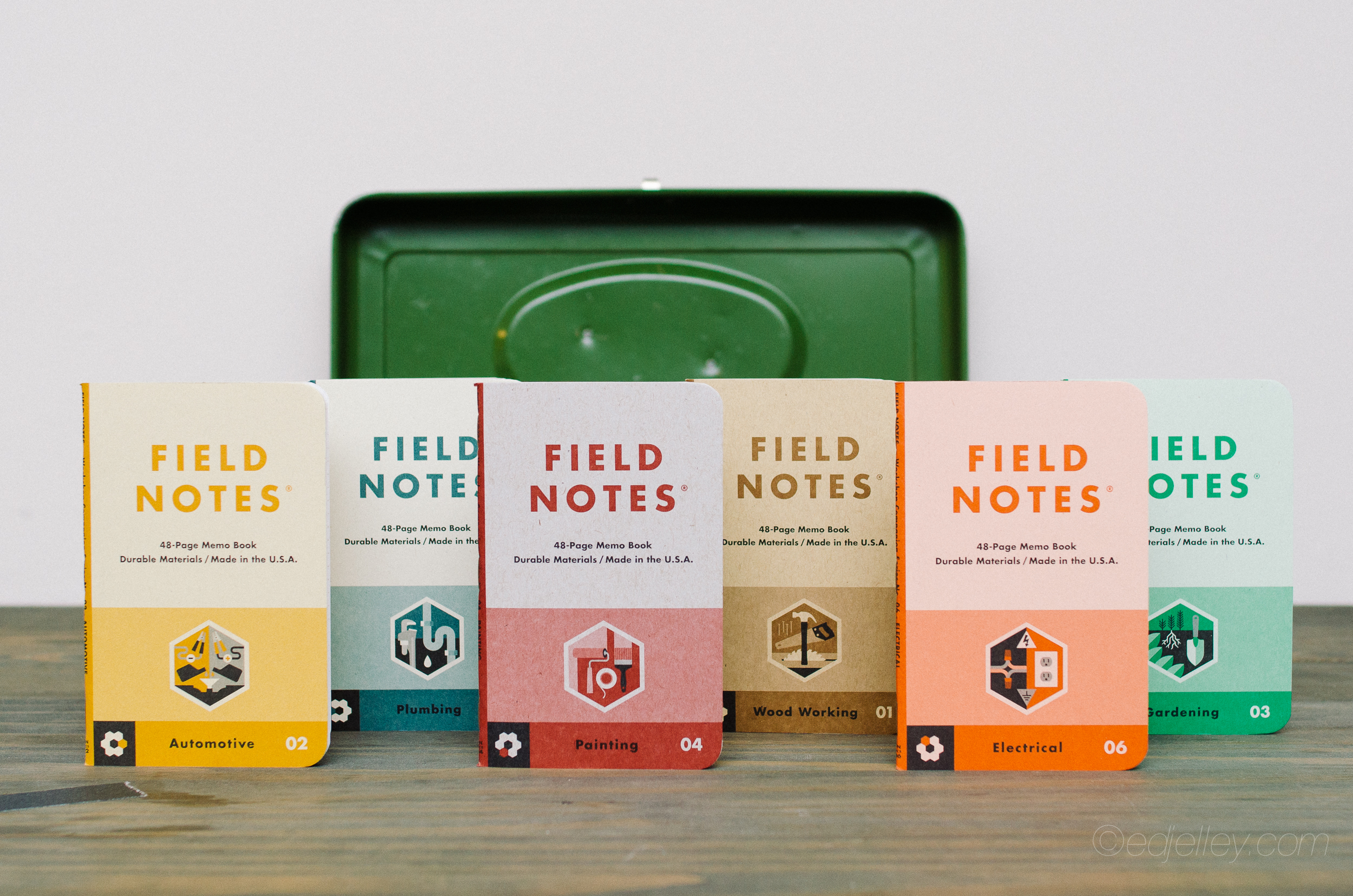 “This 27th limited COLORS edition is a set of six books, boxed in a sturdy 60-pt custom slipcase with a sheet of crack-and-peel decals. Each of the books focuses on one DIY discipline — Wood Working, Automotive, Gardening, Painting, Plumbing, and Electrical — each containing tips, reference materials and the usual Field Notes wise-cracking.