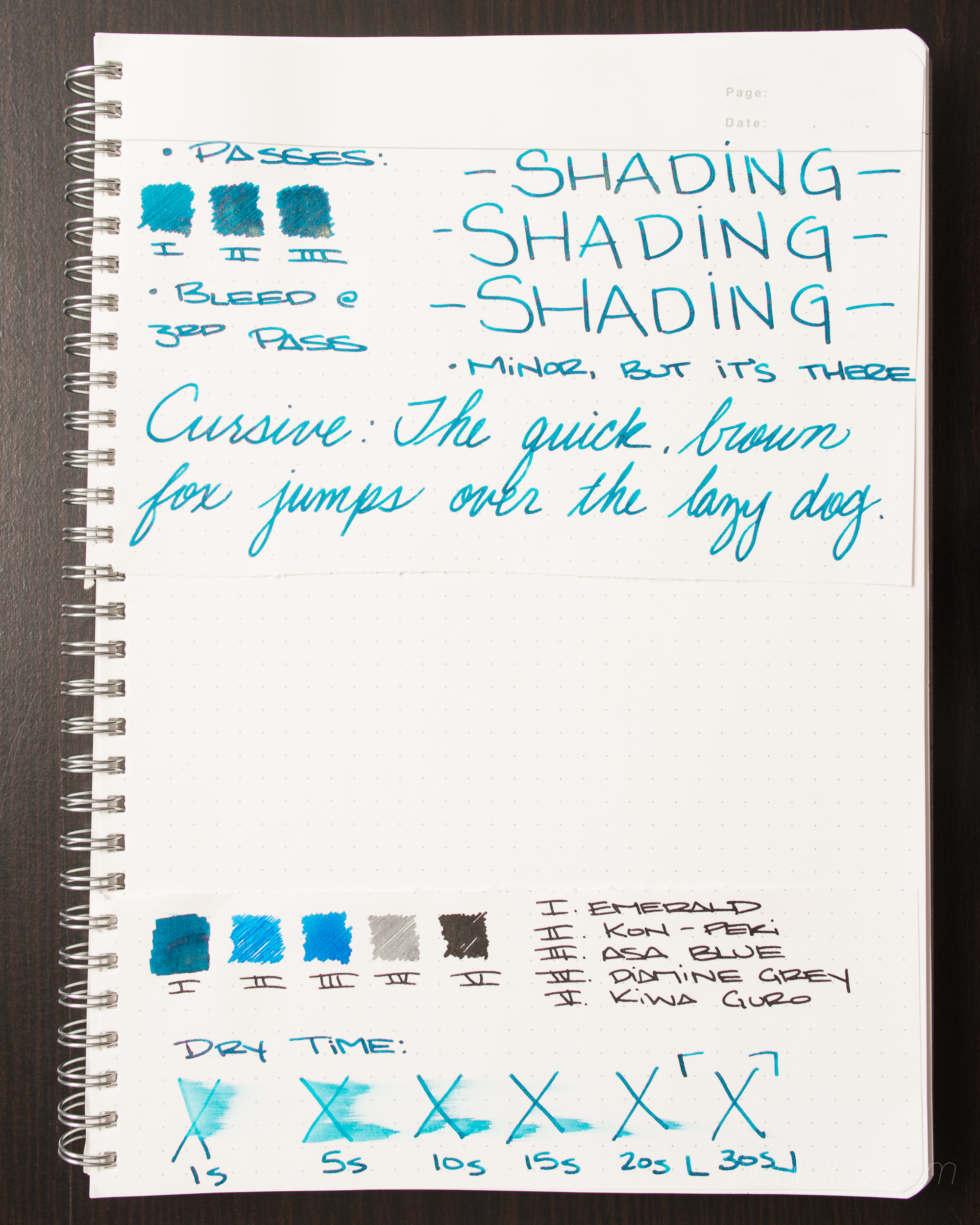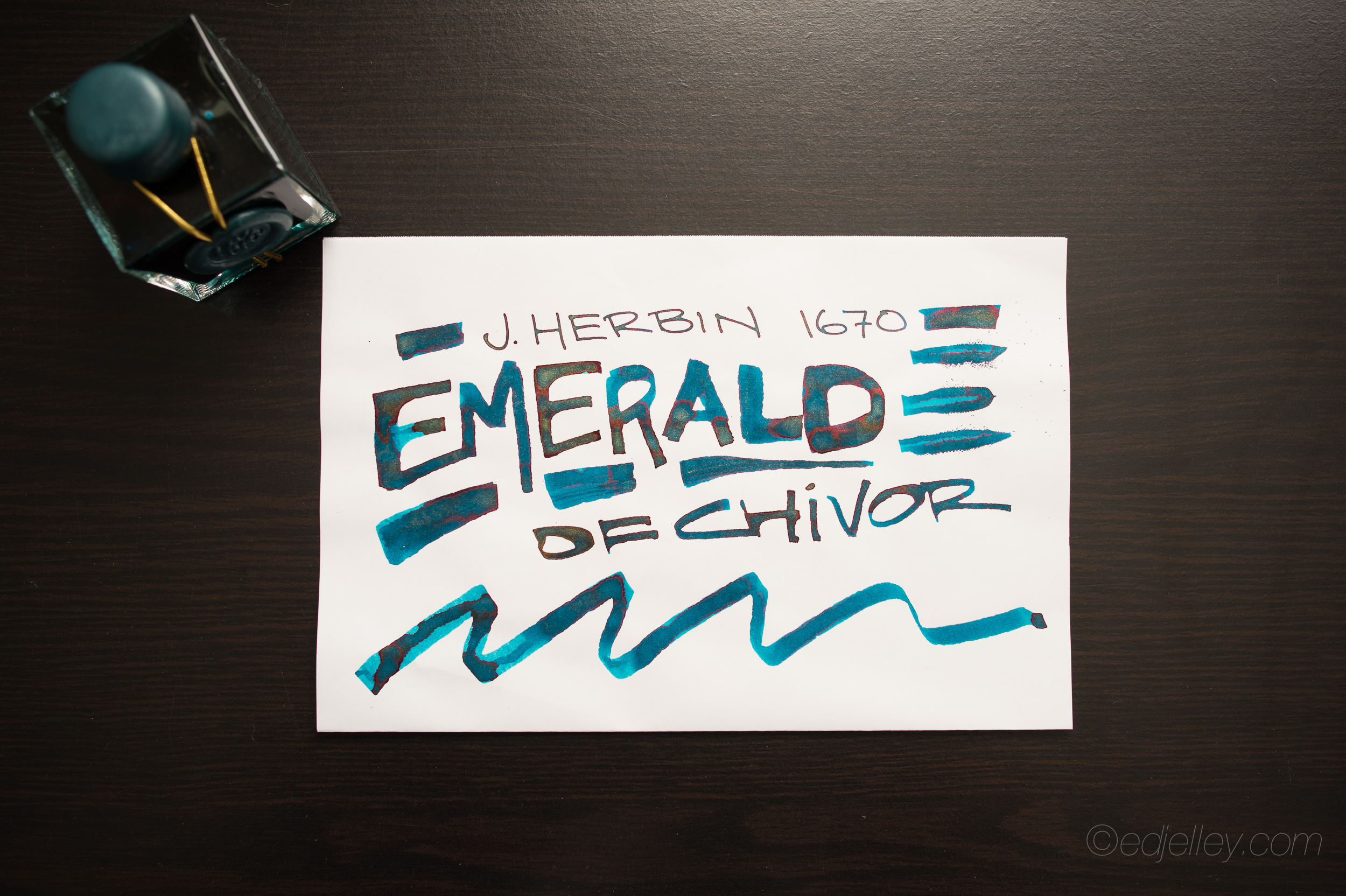So, I’ve found my new favorite ink…this one. J. Herbin’s Emerald of Chivor is an awesome shade of teal with the signature 1670 gold flakes. In addition to the gold, there’s an incredible red sheen seen around the edges of each letter and where the ink pools – resulting in an ink with intense depth. The ink flows well, if anything a bit on the wet side in my Lamy 2000’s broad nib. There’s so much depth to this interesting ink and I absolutely love it. Even my friends who have seen it (who couldn’t care less about fountain pens and ink) commented on how cool it looked. I think the ink looks best in a broad nib, and even better in a folded nib dip pen. On top of the gold flakes, the red sheen, and the high saturation, the ink has a nice degree of shading. J. Herbin really hit it out of the park with this intensely complex ink!