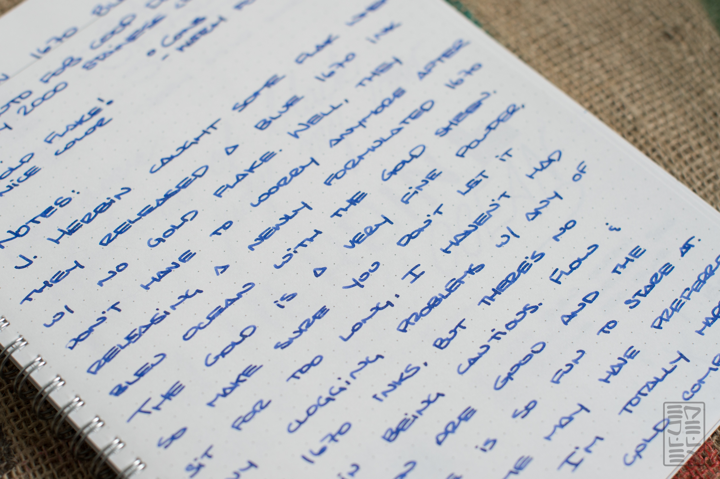 J. Herbin caught some flak when they released a blue 1670 ink a few years back and it had no gold flake. Well, no need to worry any more, as they’ve added a good amount of it to their deep blue 1670 ink. The gold flake (shimmer, whatever you want to call it) is a very fine powder, so be careful about leaving it in any one pen for too long. I haven’t had any clogging issues with regular use, but there’s no harm in being a little bit more cautious with this ink. Flow and saturation are good, and the gold flake really pops against the darker blue. Although some may have preferred a silver sheen, don’t knock it until you try it. The blue and gold looks pretty great in my opinion.