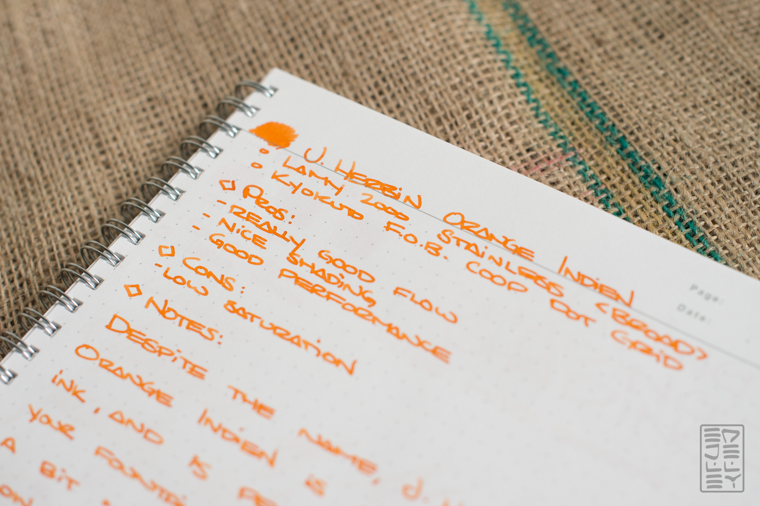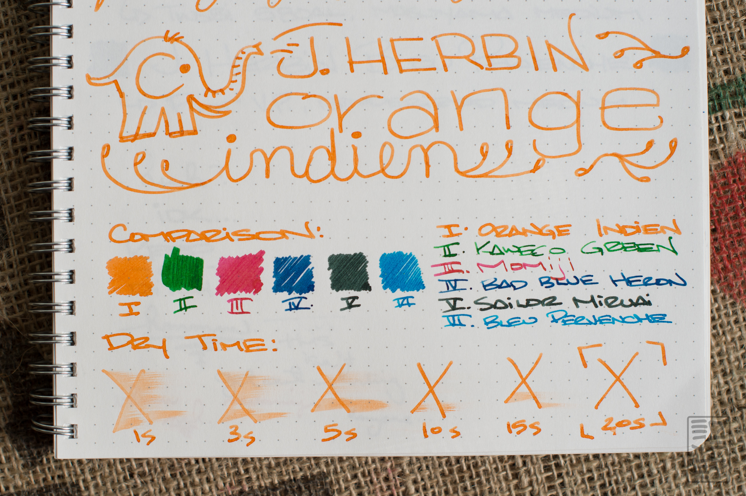 Despite the name, J. Herbin’s Orange Indien is not an india ink, and it will perform just fine in your fountain pen. The ink writes a bit “thin”, which results in great flow, but low saturation. It’s not the brightest ink on the page, but it does exhibit some nice, low-key shading. The color isn’t very bright like Noodler’s Apache Sunset, making it a nice middle of the road orange. Orange Indien is definitely legible on bright white paper, but maybe not as much on cream or off-white. I’m not huge on this orange, but the small bottle is just enough to get a few good fills out of it! Thanks to JetPens for sending the bottle over for review!