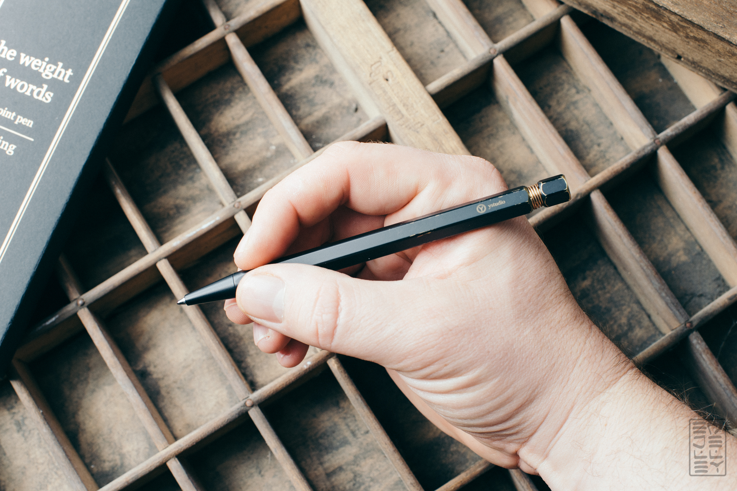Let’s start with the packaging. It’s fantastic. Usually, I don’t care in the slightest about the box that a pen comes in, but in this case the presentation is so nice that I couldn’t just ignore it. There’s a sleeved cardboard box with gold colored writing on it that bears YSTUDIO’s slogan, “The Weight of Words”. Pull out the sleeve via the brass screw (nice touch again) and you’ll find a textured paper pamphlet explaining how to use the pen and a sheet of sandpaper (should you want to speed up the patina process). The presentation is simple, neat, and looks great without being over the top. The packaging definitely does a great job of presenting the pen inside. It’s coherent and well thought out, and I appreciate their attention to detail.