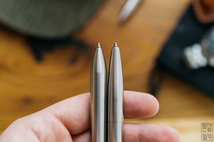 Moving to the tip of the pen, you’ll notice a completely reworked profile. One that I believe works much better. The old tip profile was a much longer taper that terminated in a chunky tip. It was probably my least favorite part about the pen. Personally, I prefer the newer version. The diameter of the pen holds for a bit longer, then starts tapering more sharply towards the tip. There’s less metal around the hole where the refill sticks out, so you have a much better view of where the ink is hitting the page. The difference in tip profiles are much easier to notice when using the pens side by side.
