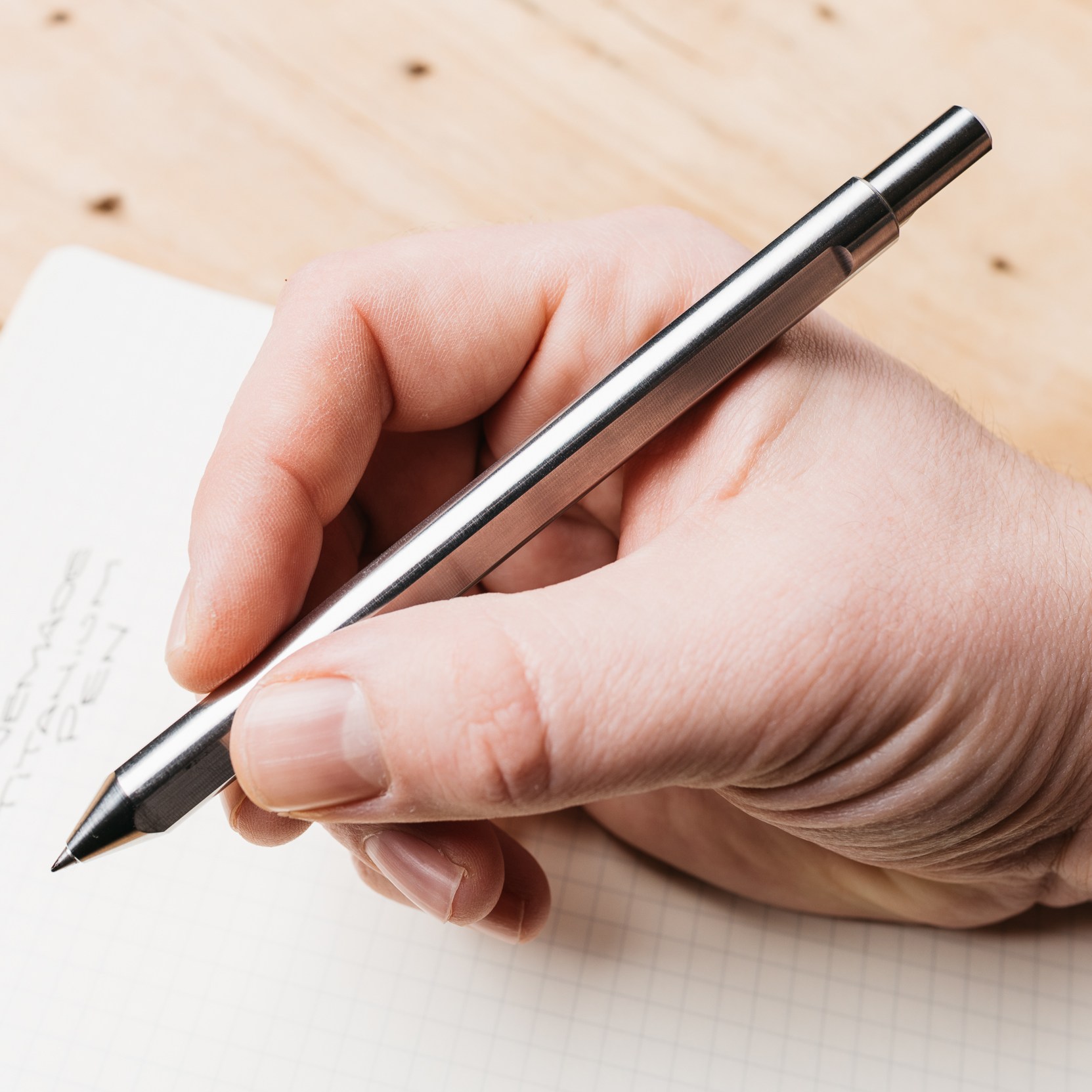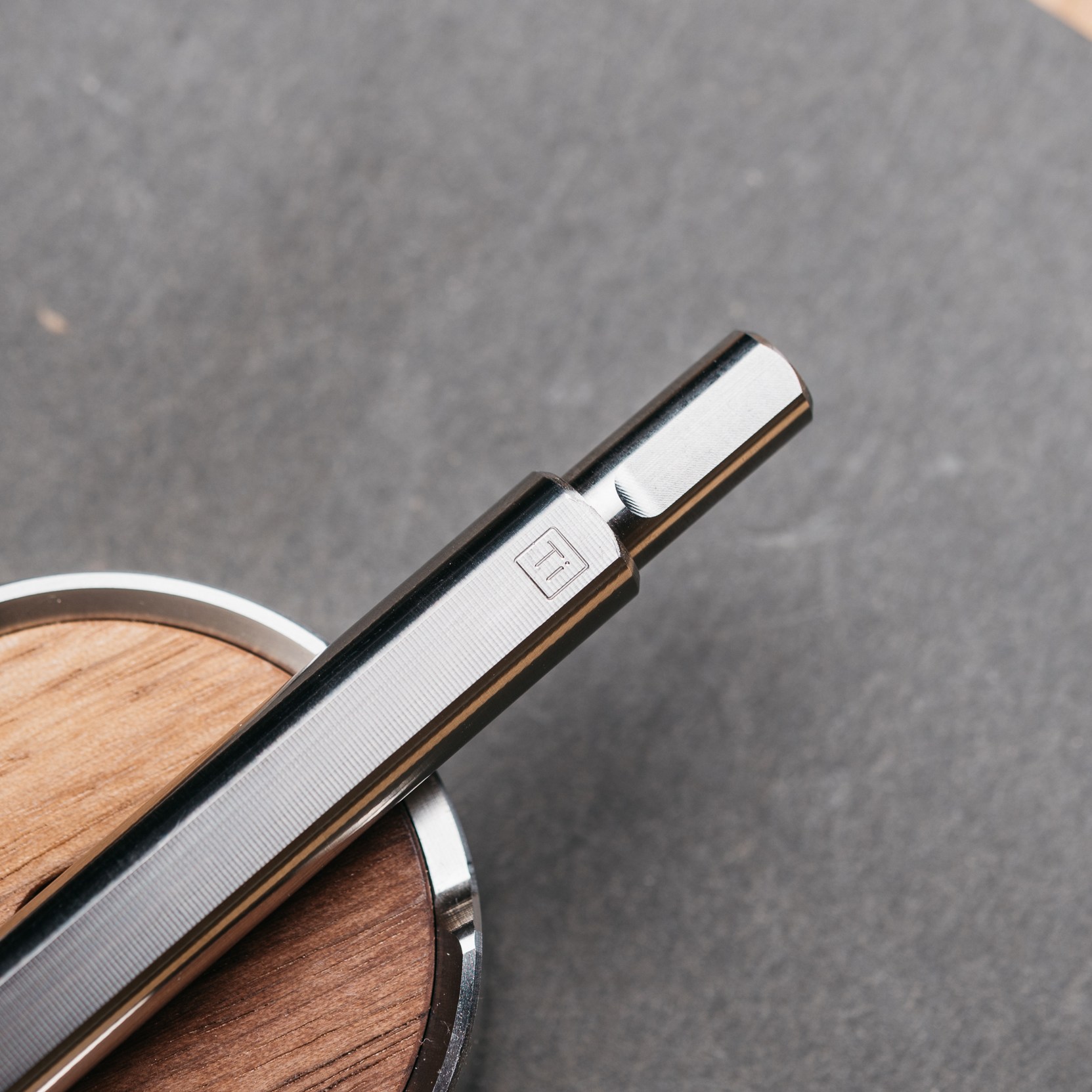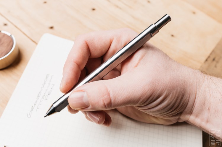 The pen has three flattened surfaces on it to keep it from rolling all over the place on your desk. Each side also provides a surface for your fingers to rest on, ideal if you hold your pen with a triangular grip, but less than ideal if you don’t. It’s not quite as corrective as say a Lamy Safari grip, but it does tend to guide your grip to the flat surfaces. Two of these surfaces terminate about 1/4 inch from the top of the pen, while one goes all the way to the end. This elongated flat spot allows the pen to sit flat on a desk. The design is also carried over to the twist mechanism on top. As for branding, Grove Made keeps things to a minimal here. Their logo is engraved into the top of the twist mechanism, and on this titanium version, the elemental symbol (Ti) is engraved into the body of the pen. It looks an awful lot like the BigiDesign logo, which I’m sure they didn’t intentionally do.