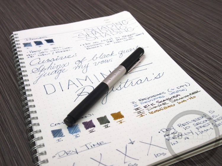 Diamine Registrar’s Ink Review Pen: Lamy Accent, 1.1mm Stub Ink: Diamine Registrar’s (Iron Gall) Paper: Kyokuto F.O.B. COOP B5 Dot Grid Pros: Nice shading Iron Gall permanence Behaves well on cheap paper Archival (until it burns through the paper in 500 years) Cons: Writes very dry Can’t be left in a pen unattended for too long Notes: […]