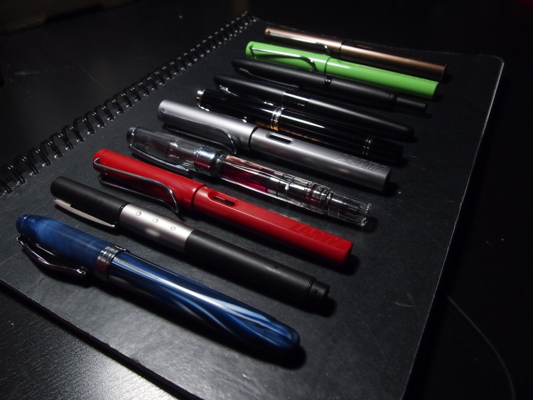 Left to Right: Noodler’s Ahab Flex, Medieval Lapis – Fine Nib – Diamine Oxblood Lamy Accent, Matte Black & Palladium – Extra Fine nib – Sailor Kiwa Guro Nano Black Lamy Safari, Red – Fine Nib – J. Herbin 1670 Rouge Hematite TWSBI Diamond 540, Demonstrator – Franklin Christoph Medium Nib – Rohrer & Klingner […]