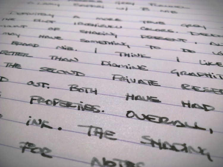 Used in Review: Private Reserve Grey Flannel Lamy Safari, Bold nib Rhodia Elastibook, ruled This ink is a great shader. I like that it’s more of a pure grey than Diamine Graphite, which I find to be a bit green for my taste. It was well behaved, but I think there may be a bit […]